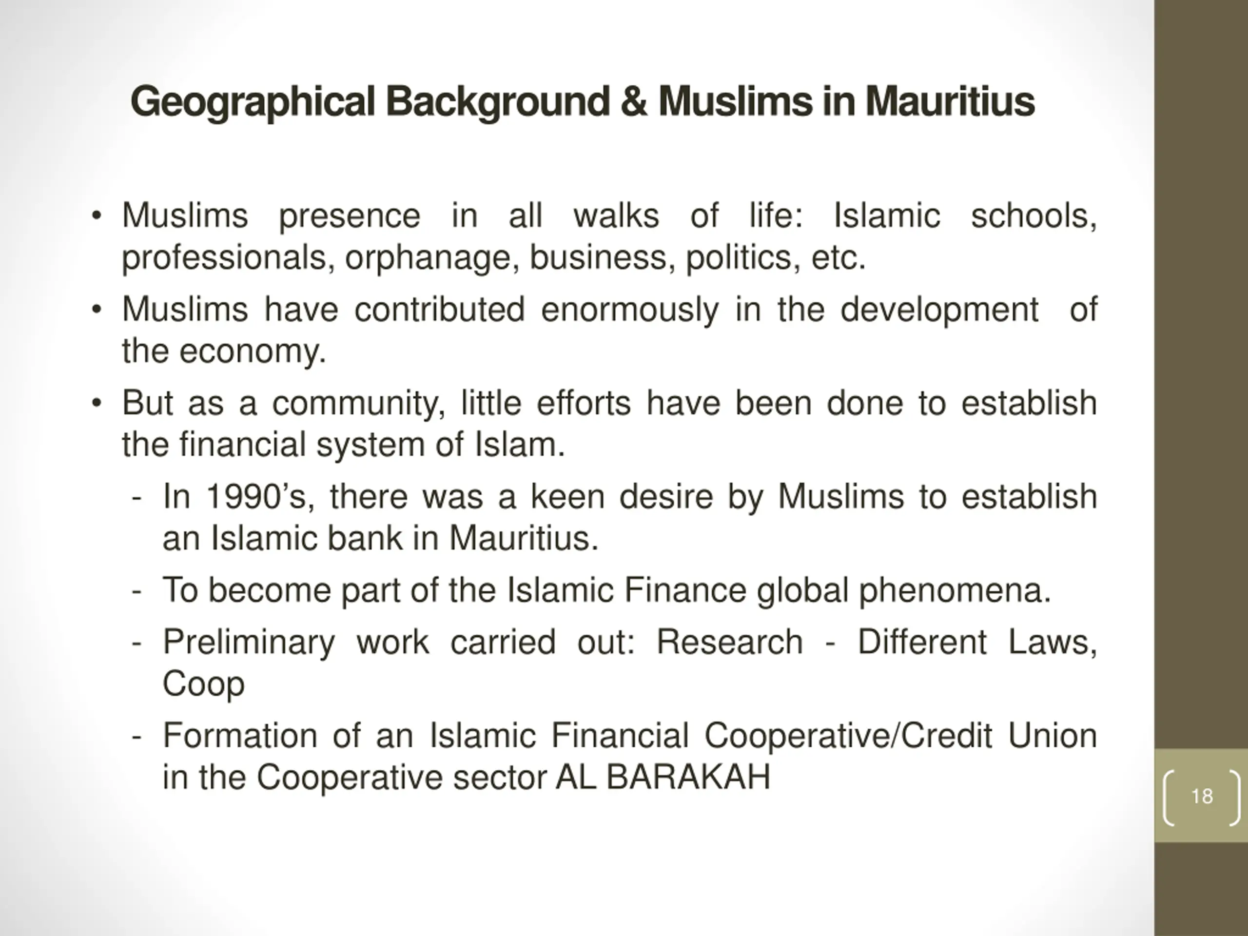Geographical Background & Muslims in Mauritius Mauritius - gateway to Africa, South Asia & Asia Multi-religious society/Democratic Population: 1.3 M 17