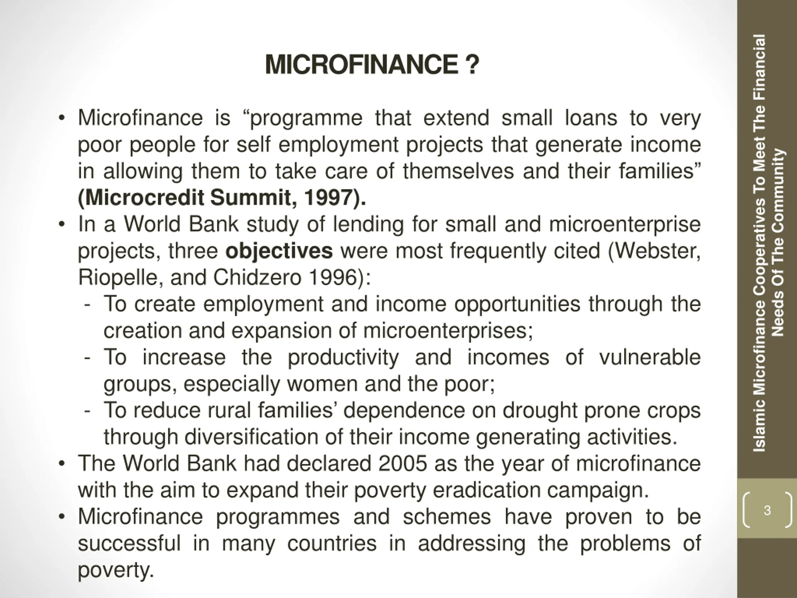 Islamic Microfinance Cooperatives To Meet The Financial MICROFINANCE ? Microfinance is programme that extend small loans to very poor people for self employment projects that generate income in allowing them to take care of themselves and their families (Microcredit Summit, 1997). In a World Bank study of lending for small and microenterprise projects, three objectives were most frequently cited (Webster, Riopelle, and Chidzero 1996): - To create employment and income opportunities through the creation and expansion of microenterprises; - To increase the productivity and incomes of vulnerable groups, especially women and the poor; - To reduce rural families dependence on drought prone crops through diversification of their income generating activities. The World Bank had declared 2005 as the year of microfinance with the aim to expand their poverty eradication campaign. Microfinance programmes and schemes have proven to be successful in many countries in addressing the problems of poverty. Needs Of The Community 3