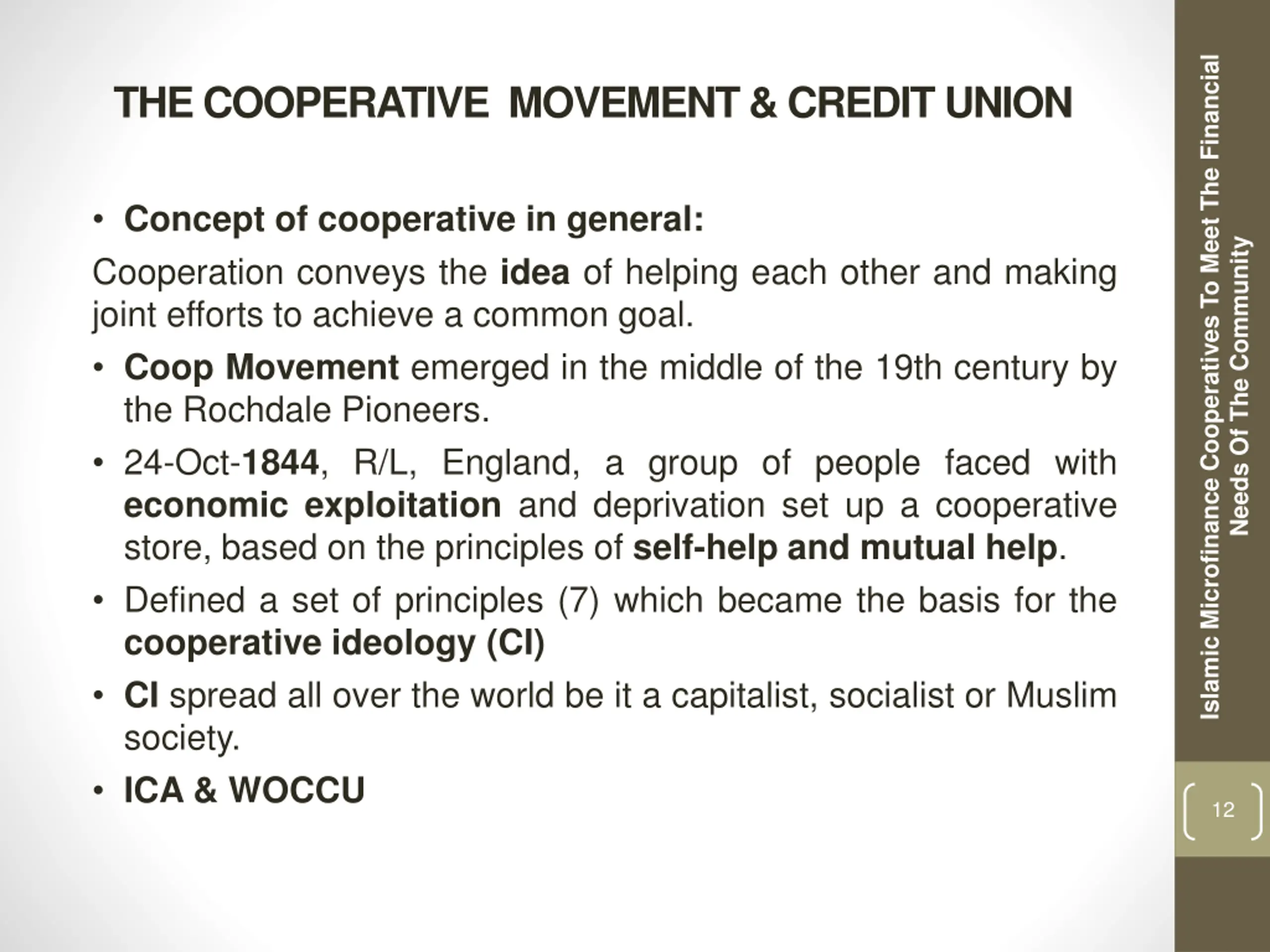 Islamic Microfinance Cooperatives To Meet The Financial THE COOPERATIVE MOVEMENT & CREDIT UNION Concept of cooperative in general: Cooperation conveys the idea of helping each other and making joint efforts to achieve a common goal. Coop Movement emerged in the middle of the 19th century by the Rochdale Pioneers. 24-Oct-1844, R/L, England, a group of people faced with economic exploitation and deprivation set up a cooperative store, based on the principles of self-help and mutual help. Defined a set of principles (7) which became the basis for the cooperative ideology (CI) CI spread all over the world be it a capitalist, socialist or Muslim society. ICA & WOCCU Needs Of The Community 12