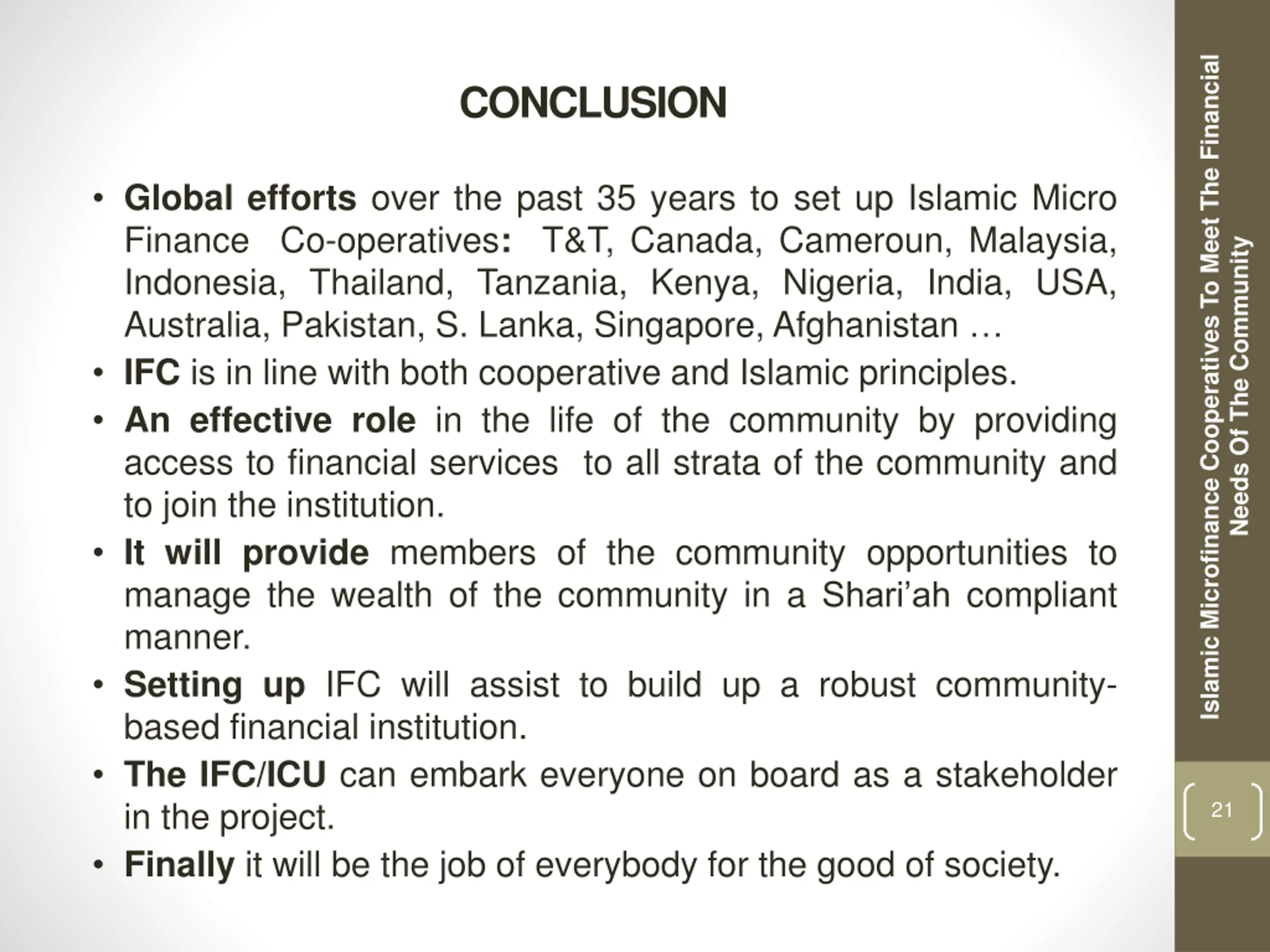 Islamic Microfinance Cooperatives To Meet The Financial CONCLUSION Global efforts over the past 35 years to set up Islamic Micro Finance Co-operatives: T&T, Canada, Cameroun, Malaysia, Indonesia, Thailand, Tanzania, Kenya, Nigeria, India, USA, Australia, Pakistan, S. Lanka, Singapore, Afghanistan IFC is in line with both cooperative and Islamic principles. An effective role in the life of the community by providing access to financial services to all strata of the community and to join the institution. It will provide members of the community opportunities to manage the wealth of the community in a Shari ah compliant manner. Setting up IFC will assist to build up a robust community- based financial institution. The IFC/ICU can embark everyone on board as a stakeholder in the project. Finally it will be the job of everybody for the good of society. Needs Of The Community 21