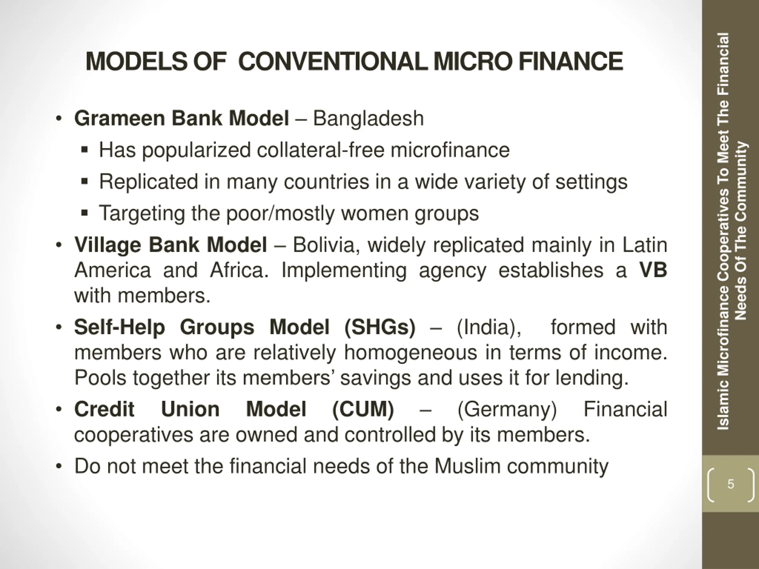 Islamic Microfinance Cooperatives To Meet The Financial MODELS OF CONVENTIONAL MICRO FINANCE Grameen Bank Model Bangladesh Has popularized collateral-free microfinance Replicated in many countries in a wide variety of settings Targeting the poor/mostly women groups Village Bank Model Bolivia, widely replicated mainly in Latin America and Africa.Implementing agency establishes a VB with members. Self-Help Groups Model (SHGs) (India), formed with members who are relatively homogeneous in terms of income. Pools together its members savings and uses it for lending. Credit Union Model (CUM) cooperatives are owned and controlled by its members. Do not meet the financial needs of the Muslim community Needs Of The Community (Germany) Financial 5