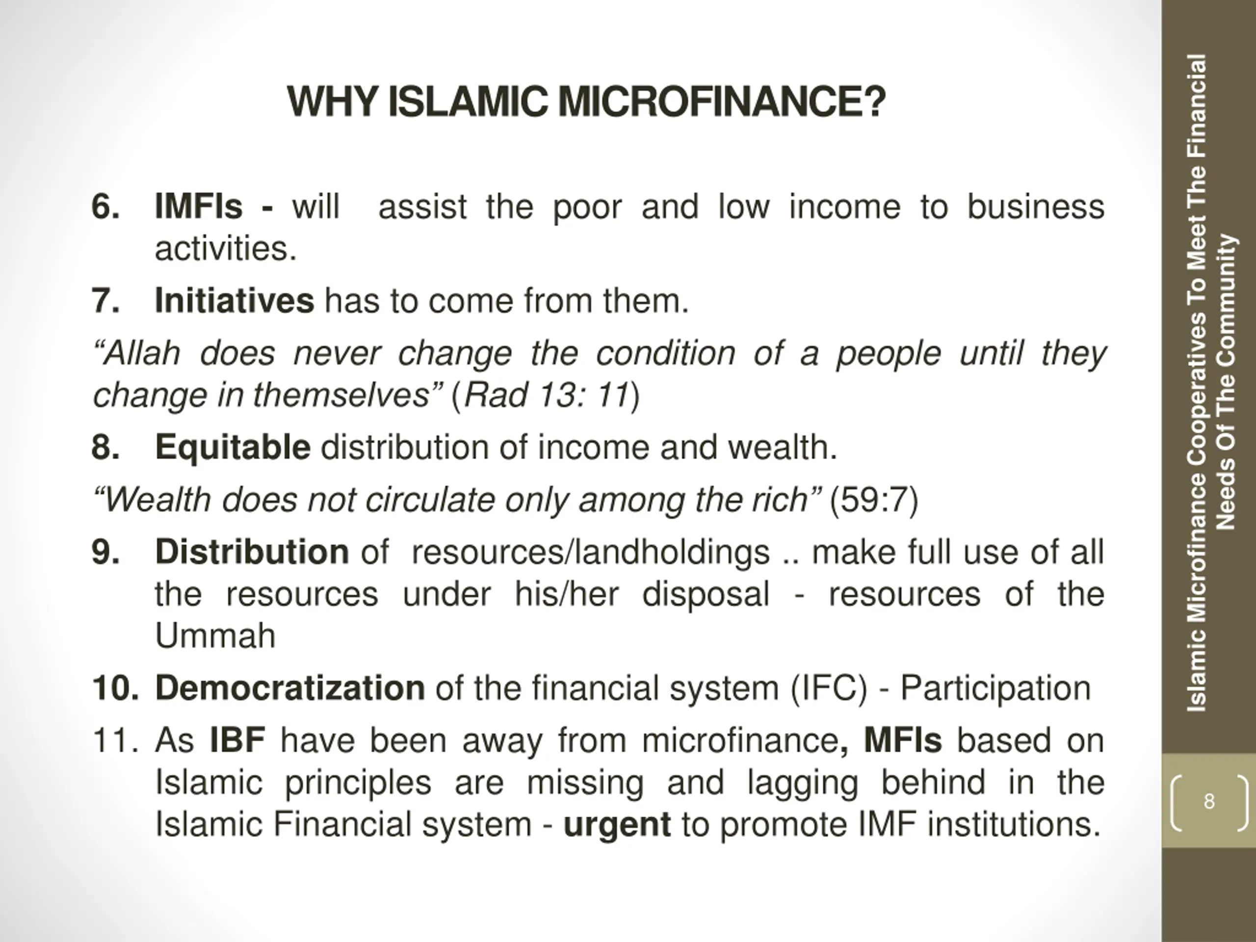 Islamic Microfinance Cooperatives To Meet The Financial WHY ISLAMIC MICROFINANCE? IMFIs - will assist the poor and low income to business activities. Initiatives hasto come from them. Allah does never change the condition of a people until they change in themselves (Rad 13: 11) 8. Equitable distribution of income and wealth. Wealth does not circulate only among the rich (59:7) 9. Distribution of resources/landholdings .. make full use of all the resources under his/her disposal - resources of the Ummah 10. Democratization of the financial system (IFC) - Participation 11. As IBF have been away from microfinance, MFIs based on Islamic principles are missing and lagging behind in the Islamic Financial system - urgent to promote IMF institutions. 6. Needs Of The Community 7. 8
