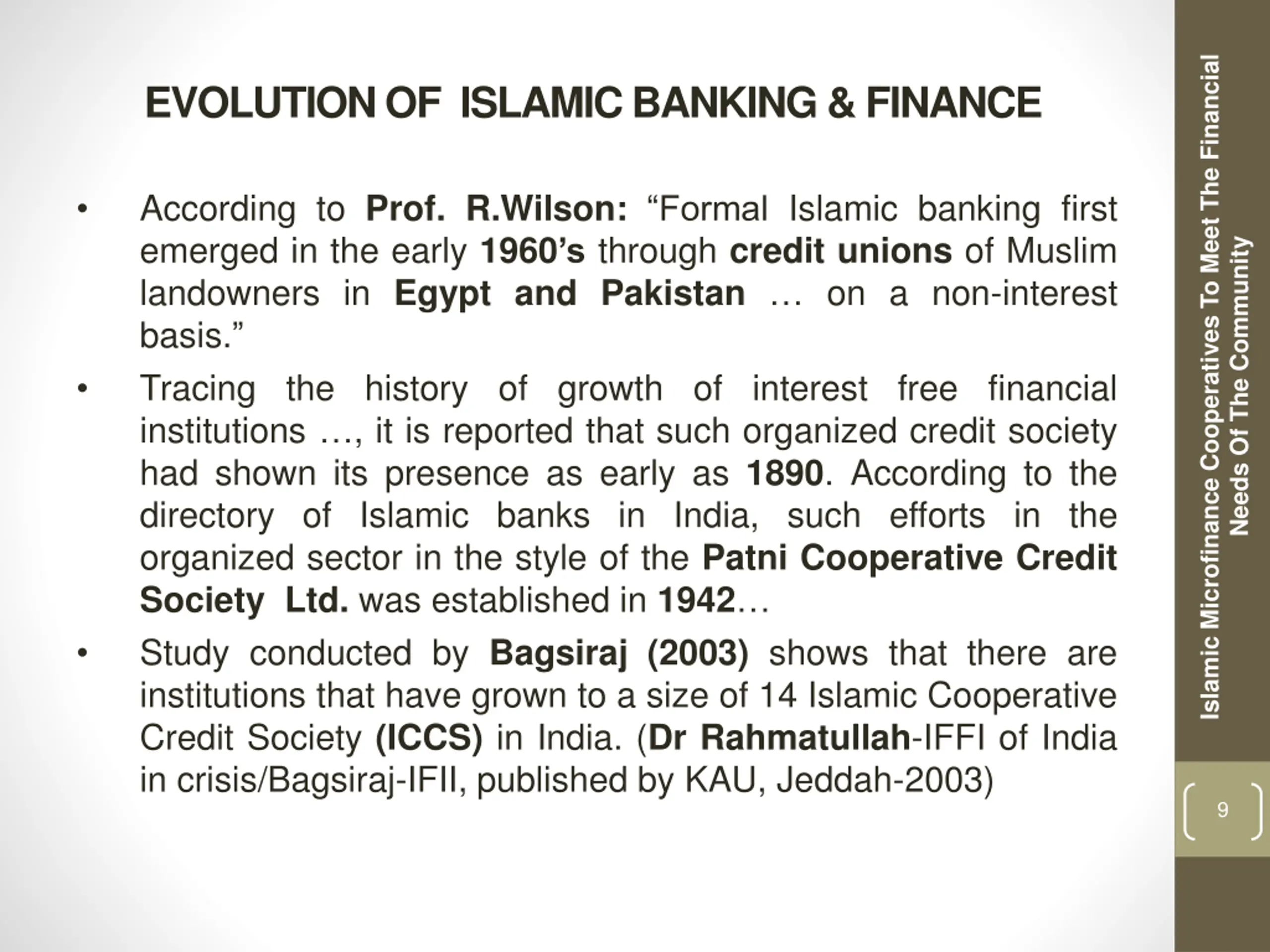 Islamic Microfinance Cooperatives To Meet The Financial EVOLUTION OF ISLAMIC BANKING & FINANCE According to Prof. R.Wilson: Formal Islamic banking first emerged in the early 1960 s through credit unions of Muslim landowners in Egypt and Pakistan on a non-interest basis. Tracing the history of growth of interest free financial institutions , it is reported that such organized credit society had shown its presence as early as 1890. According to the directory of Islamic banks in India, such efforts in the organized sector in the style of the Patni Cooperative Credit Society Ltd. was established in 1942 Study conducted by Bagsiraj (2003) shows that there are institutions that have grown to a size of 14 Islamic Cooperative Credit Society (ICCS) in India. (Dr Rahmatullah-IFFI of India in crisis/Bagsiraj-IFII, published by KAU, Jeddah-2003) Needs Of The Community 9