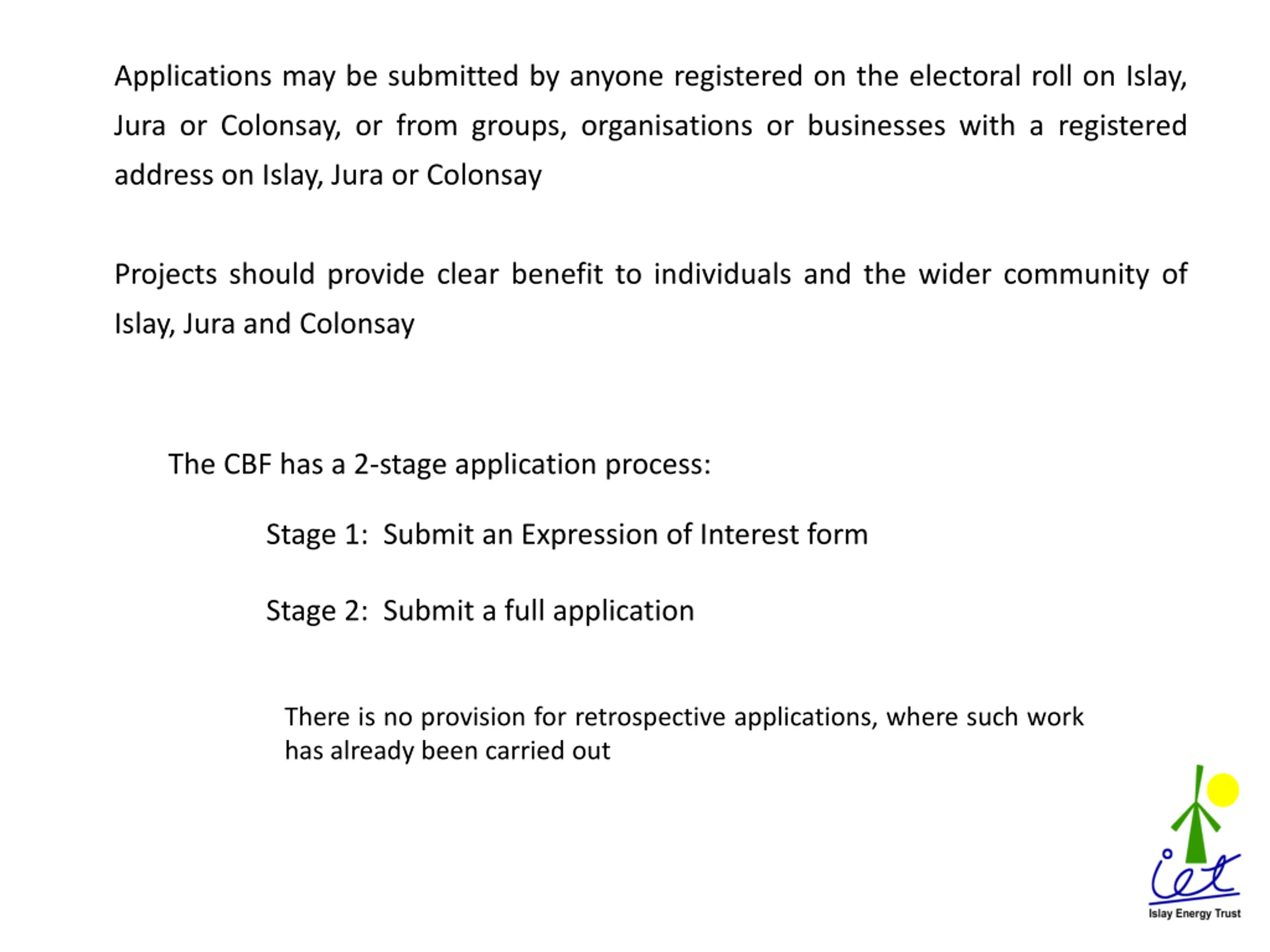 Applications may be submitted by anyone registered on the electoral roll on Islay, Jura or Colonsay, or from groups, organisations or businesses with a registered address on Islay, Jura or Colonsay Projects should provide clear benefit to individuals and the wider community of Islay, Jura and Colonsay The CBF has a 2-stage application process: Stage 1: Submit an Expression of Interest form Stage 2: Submit a full application There is no provision for retrospective applications, where such work has already been carried out