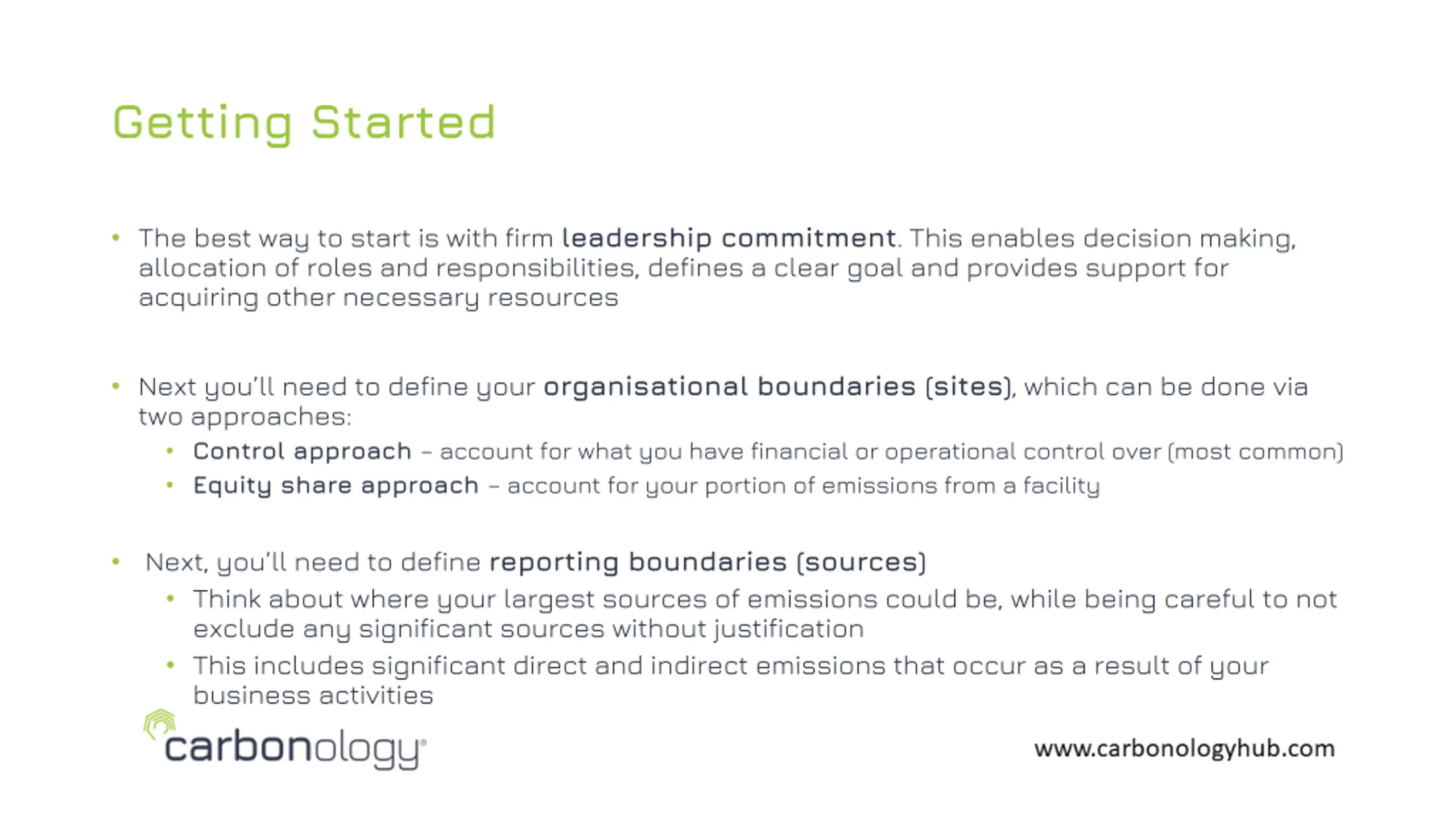 Getting Started The best way to start is with firm leadership commitment. This enables decision making, allocation of roles and responsibilities, defines a clear goal and provides support for acquiring other necessary resources Next you ll need to define your organisational boundaries (sites), which can be done via two approaches: Control approach account for what you have financial or operational control over (most common) Equity share approach account for your portion of emissions from a facility Next, you ll need to define reporting boundaries (sources) Think about where your largest sources of emissions could be, while being careful to not exclude any significant sources without justification This includes significant direct and indirect emissions that occur as a result of your business activities