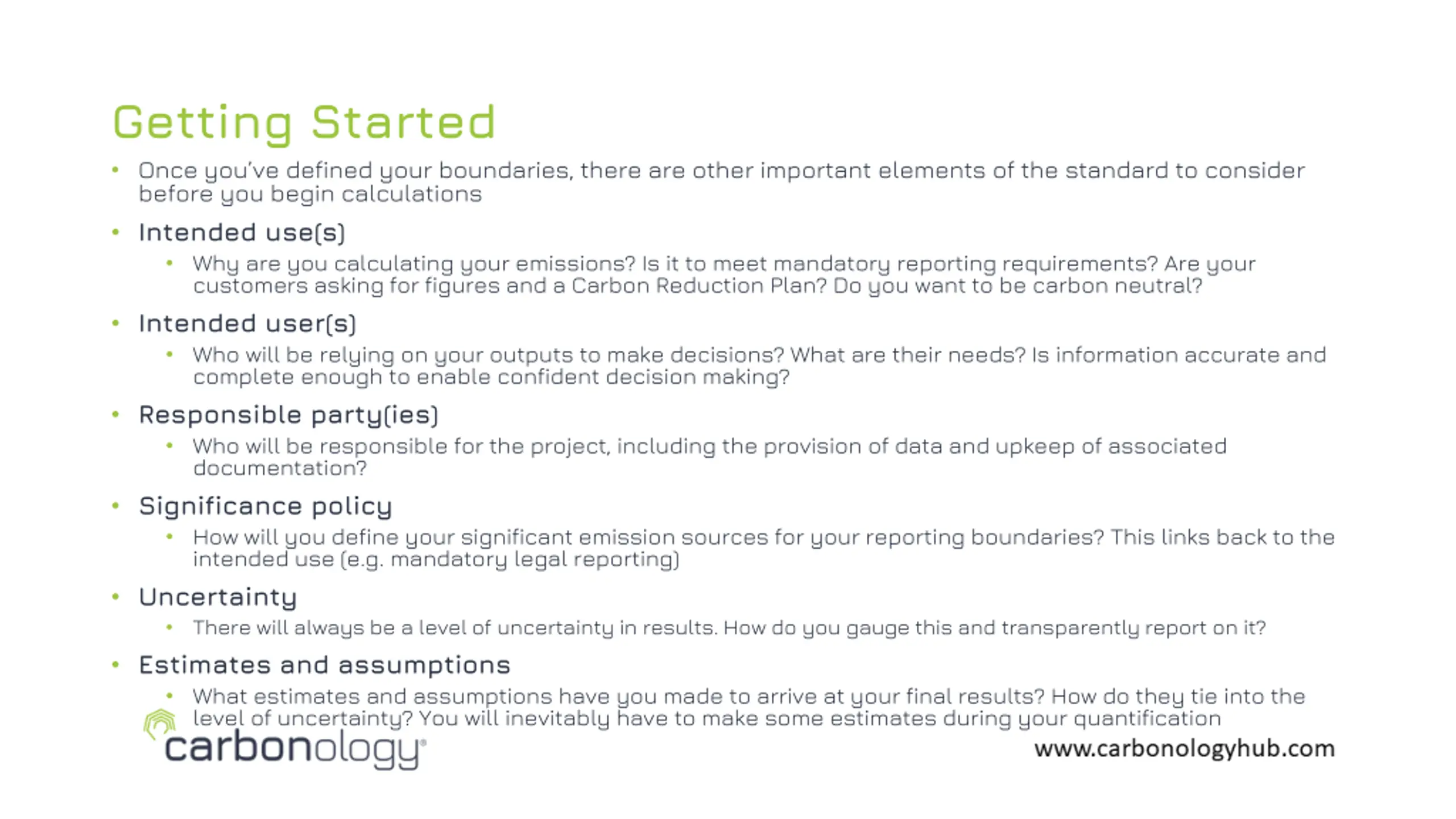 Getting Started Once you ve defined your boundaries, there are other important elements of the standard to consider before you begin calculations Intended use(s) Why are you calculating your emissions? Is it to meet mandatory reporting requirements? Are your customers asking for figures and a Carbon Reduction Plan? Do you want to be carbon neutral? Intended user(s) Who will be relying on your outputs to make decisions? What are their needs? Is information accurate and complete enough to enable confident decision making? Responsible party(ies) Who will be responsible for the project, including the provision of data and upkeep of associated documentation? Significance policy How will you define your significant emission sources for your reporting boundaries? This links back to the intended use (e.g. mandatory legal reporting) Uncertainty There will always be a level of uncertainty in results. How do you gauge this and transparently report on it? Estimates and assumptions What estimates and assumptions have you made to arrive at your final results? How do they tie into the level of uncertainty? You will inevitably have to make some estimates during your quantification