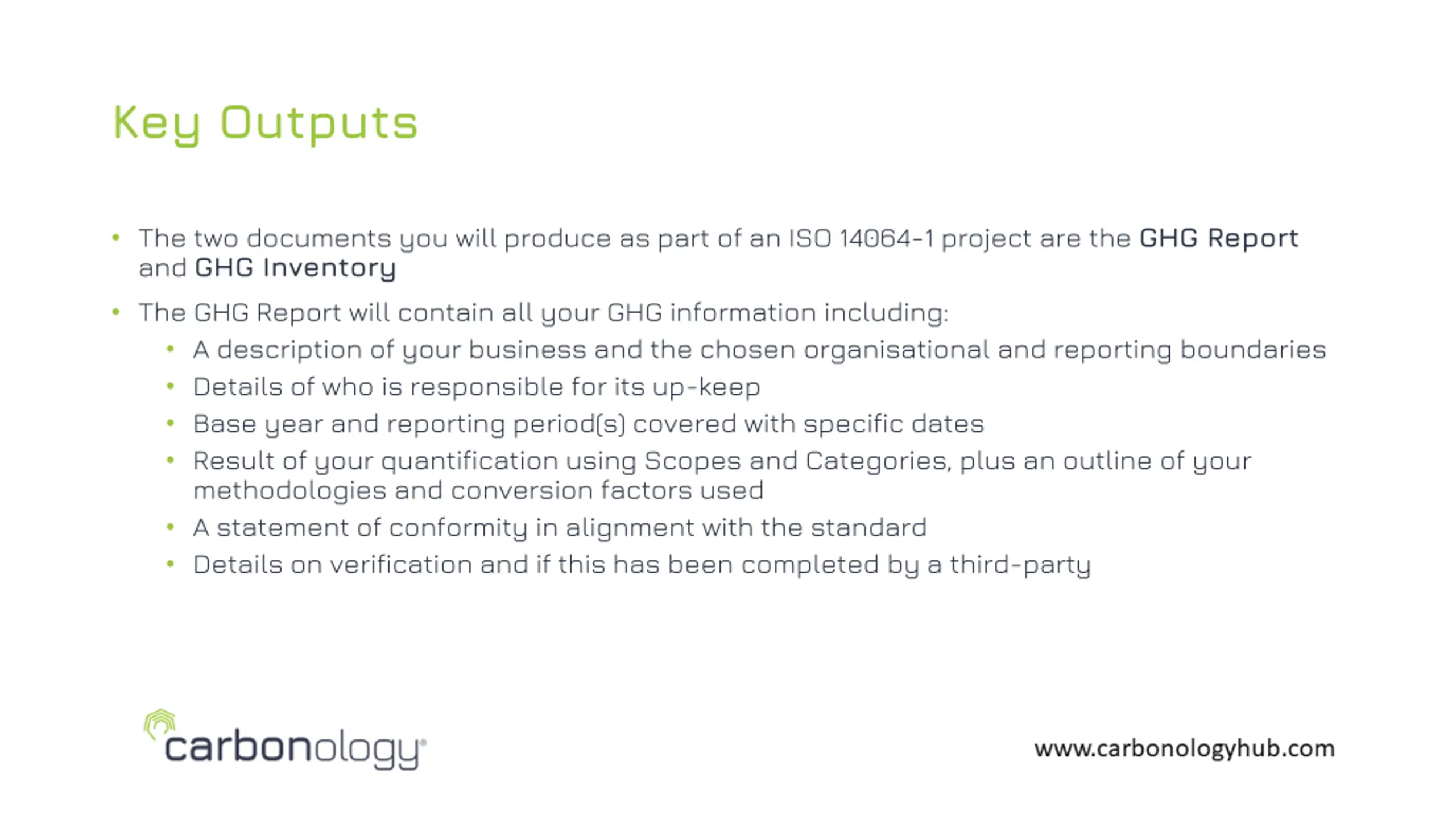 Key Outputs The two documents you will produce as part of an ISO 14064-1 project are the GHG Report and GHG Inventory The GHG Report will contain all your GHG information including: A description of your business and the chosen organisational and reporting boundaries Details of who is responsible for its up-keep Base year and reporting period(s) covered with specific dates Result of your quantification using Scopes and Categories, plus an outline of your methodologies and conversion factors used A statement of conformity in alignment with the standard Details on verification and if this has been completed by a third-party