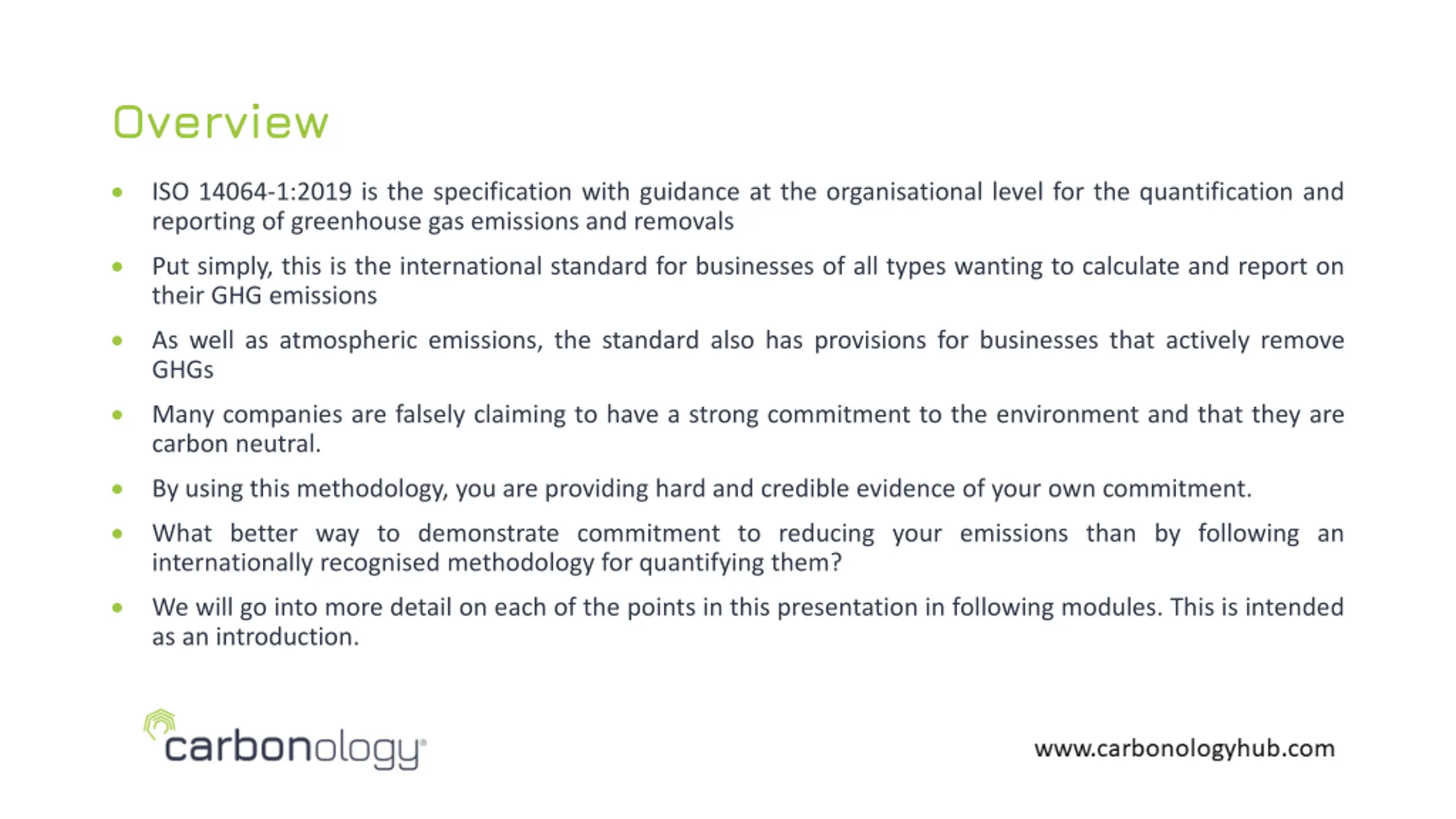 Overview ISO 14064-1:2019 is the specification with guidance at the organisational level for the quantification and reporting of greenhouse gas emissions and removals Put simply, this is the international standard for businesses of all types wanting to calculate and report on their GHG emissions As well as atmospheric emissions, the standard also has provisions for businesses that actively remove GHGs Many companies are falsely claiming to have a strong commitment to the environment and that they are carbon neutral. By using this methodology, you are providing hard and credible evidence of your own commitment. What better way to demonstrate commitment to reducing your emissions than by following an internationally recognised methodology for quantifying them? We will go into more detail on each of the points in this presentation in following modules. This is intended as an introduction.