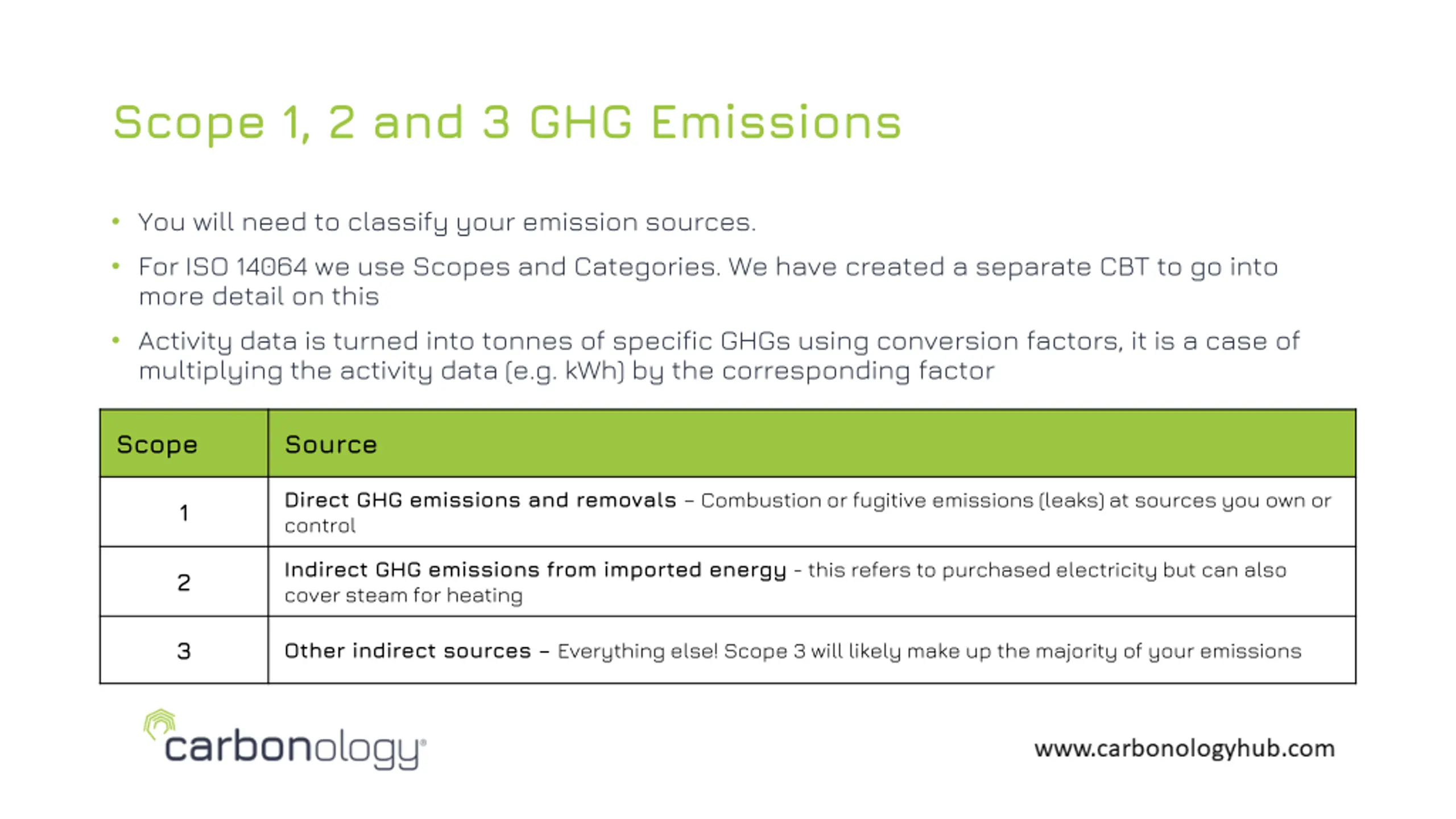 Scope 1, 2 and 3 GHG Emissions You will need to classify your emission sources. For ISO 14064 we use Scopes and Categories. We have created a separate CBT to go into more detail on this Activity data is turned into tonnes of specific GHGs using conversion factors, it is a case of multiplying the activity data (e.g. kWh) by the corresponding factor Scope Source Direct GHG emissions and removals Combustion or fugitive emissions (leaks) at sources you own or control 1 Indirect GHG emissions from imported energy - this refers to purchased electricity but can also cover steam for heating 2 3 Other indirect sources Everything else! Scope 3 will likely make up the majority of your emissions