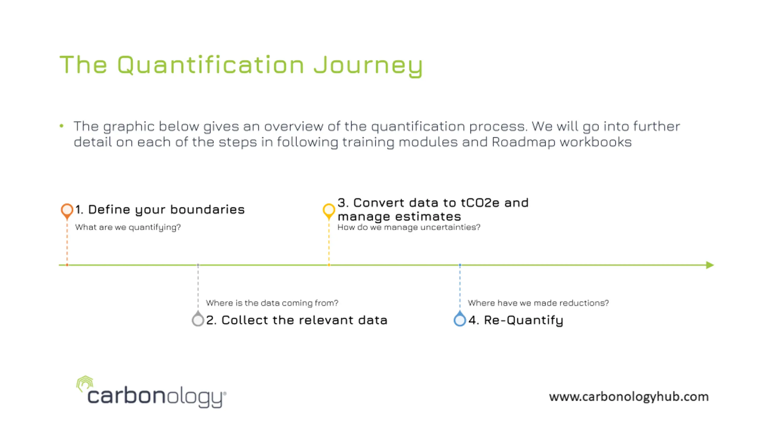 The Quantification Journey The graphic below gives an overview of the quantification process. We will go into further detail on each of the steps in following training modules and Roadmap workbooks 3. Convert data to tCO2e and manage estimates 1. Define your boundaries What are we quantifying? How do we manage uncertainties? Where is the data coming from? 2. Collect the relevant data Where have we made reductions? 4. Re-Quantify