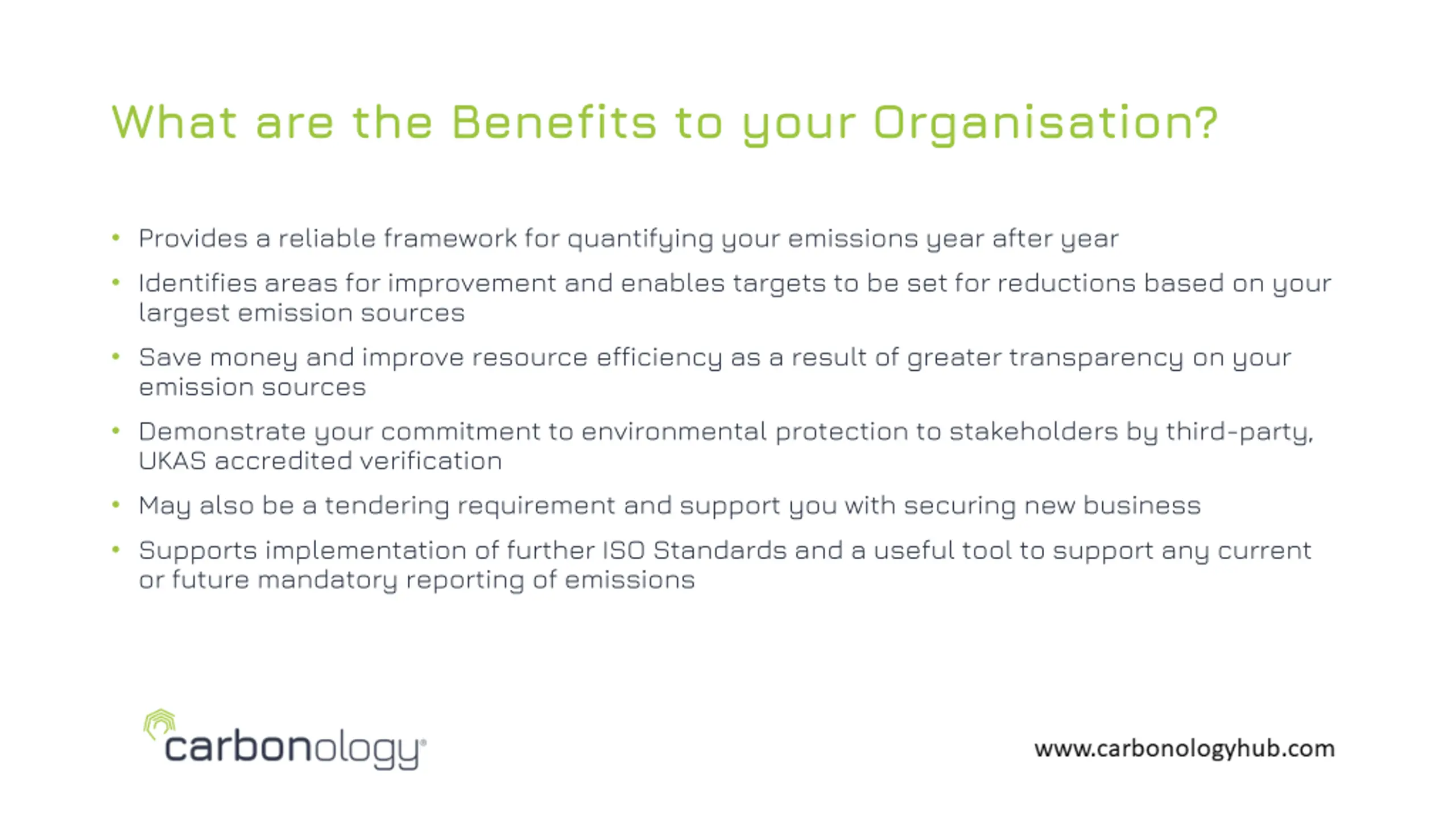 What are the Benefits to your Organisation? Provides a reliable framework for quantifying your emissions year after year Identifies areas for improvement and enables targets to be set for reductions based on your largest emission sources Save money and improve resource efficiency as a result of greater transparency on your emission sources Demonstrate your commitment to environmental protection to stakeholders by third-party, UKAS accredited verification May also be a tendering requirement and support you with securing new business Supports implementation of further ISO Standards and a useful tool to support any current or future mandatory reporting of emissions