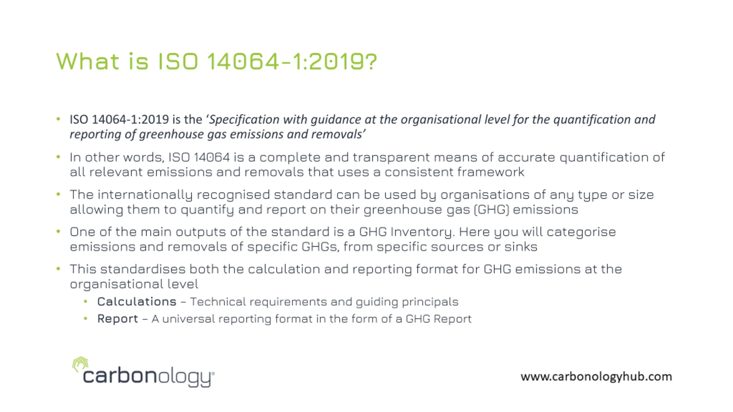 What is ISO 14064-1:2019? ISO 14064-1:2019 is the Specification with guidance at the organisational level for the quantification and reporting of greenhouse gas emissions and removals In other words, ISO 14064 is a complete and transparent means of accurate quantification of all relevant emissions and removals that uses a consistent framework The internationally recognised standard can be used by organisations of any type or size allowing them to quantify and report on their greenhouse gas (GHG) emissions One of the main outputs of the standard is a GHG Inventory. Here you will categorise emissions and removals of specific GHGs, from specific sources or sinks This standardises both the calculation and reporting format for GHG emissions at the organisational level Calculations Technical requirements and guiding principals Report A universal reporting format in the form of a GHG Report