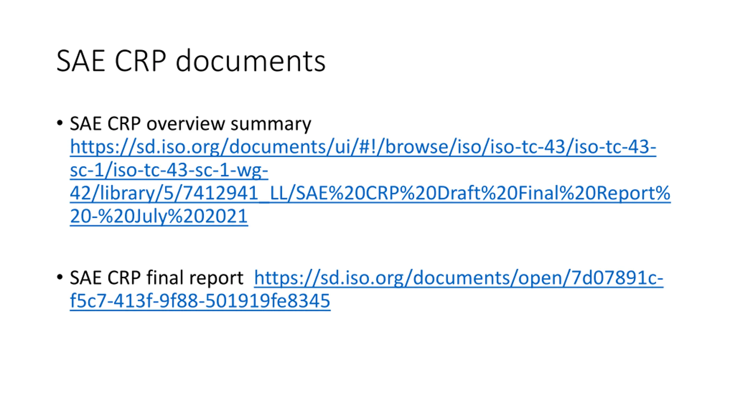 SAE CRP documents SAE CRP overview summary https://sd.iso.org/documents/ui/#!/browse/iso/iso-tc-43/iso-tc-43- sc-1/iso-tc-43-sc-1-wg- 42/library/5/7412941_LL/SAE%20CRP%20Draft%20Final%20Report% 20-%20July%202021 SAE CRP final report https://sd.iso.org/documents/open/7d07891c- f5c7-413f-9f88-501919fe8345