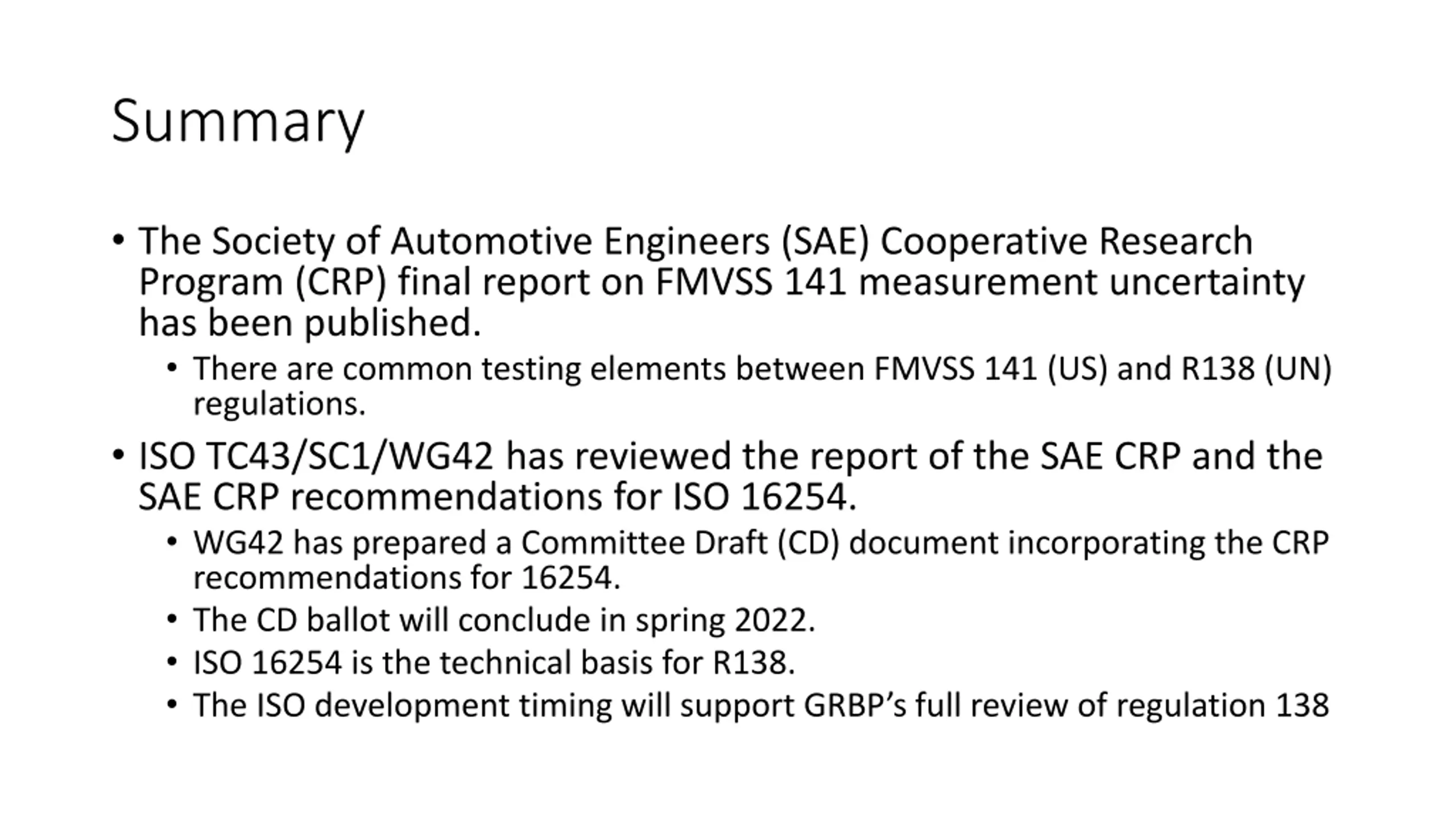 Summary The Society of Automotive Engineers (SAE) Cooperative Research Program (CRP) final report on FMVSS 141 measurement uncertainty has been published. There are common testing elements between FMVSS 141 (US) and R138 (UN) regulations. ISO TC43/SC1/WG42 has reviewed the report of the SAE CRP and the SAE CRP recommendations for ISO 16254. WG42 has prepared a Committee Draft (CD) document incorporating the CRP recommendations for 16254. The CD ballot will conclude in spring 2022. ISO 16254 is the technical basis for R138. The ISO development timing will support GRBP s full review of regulation 138