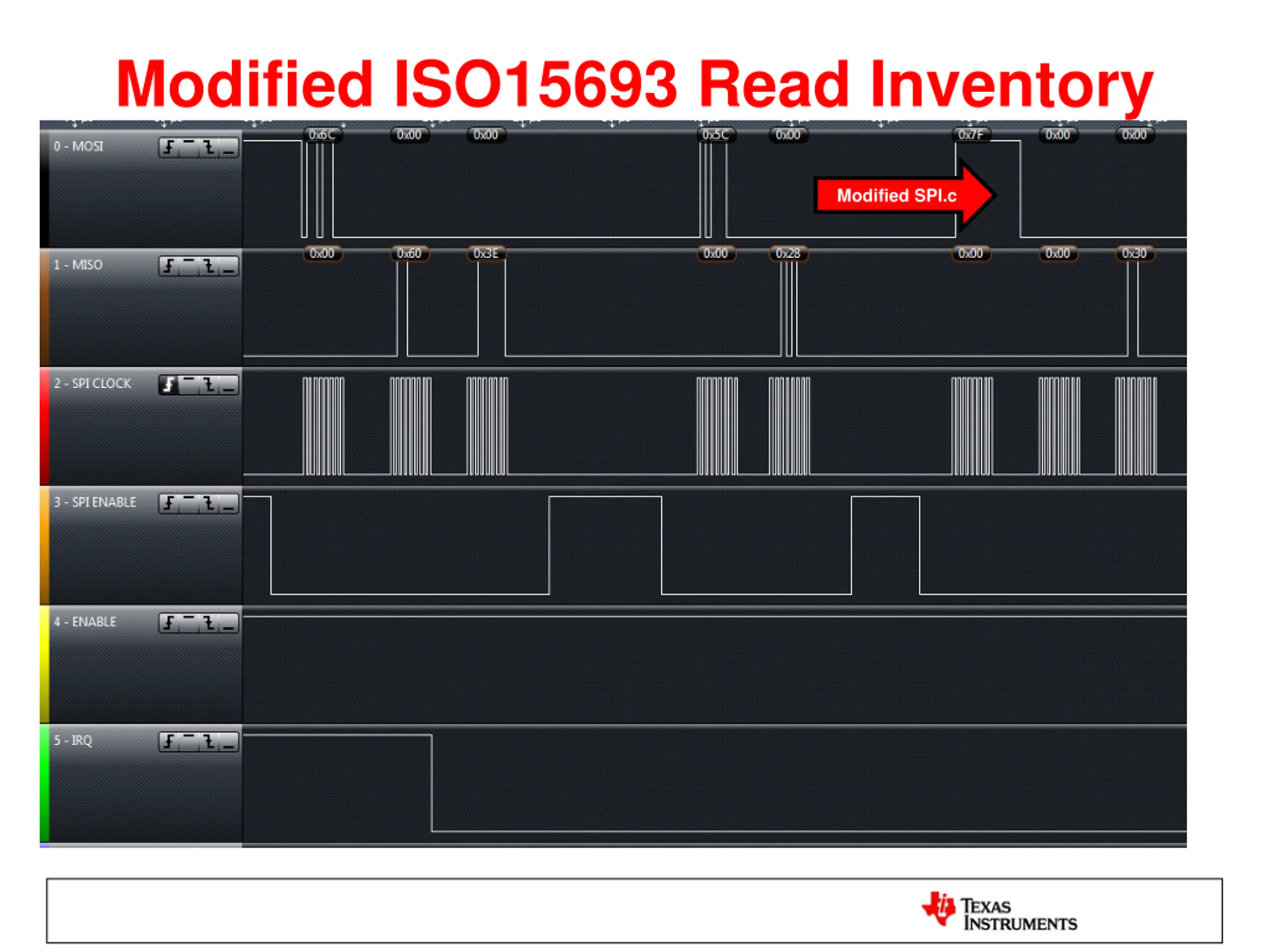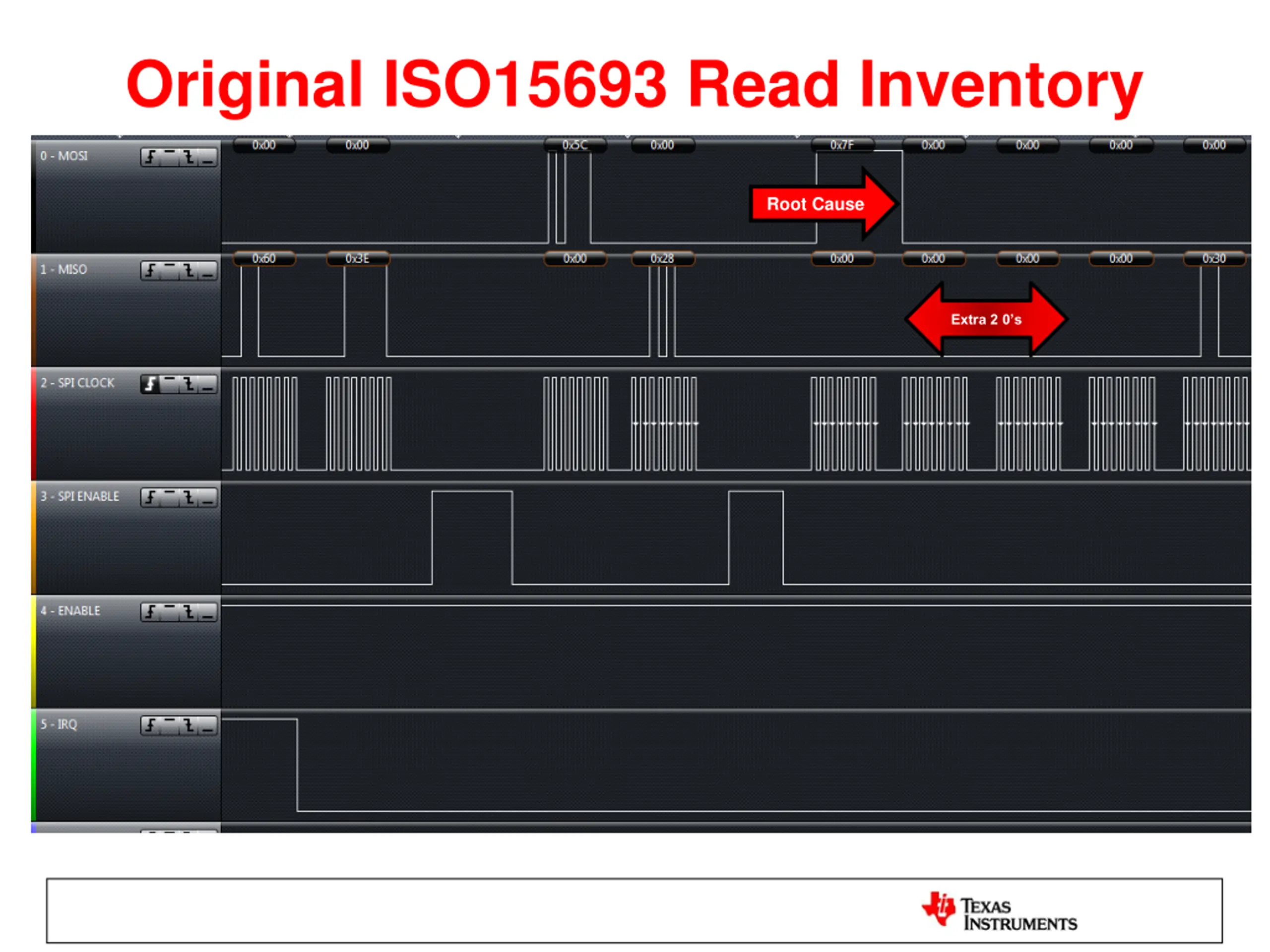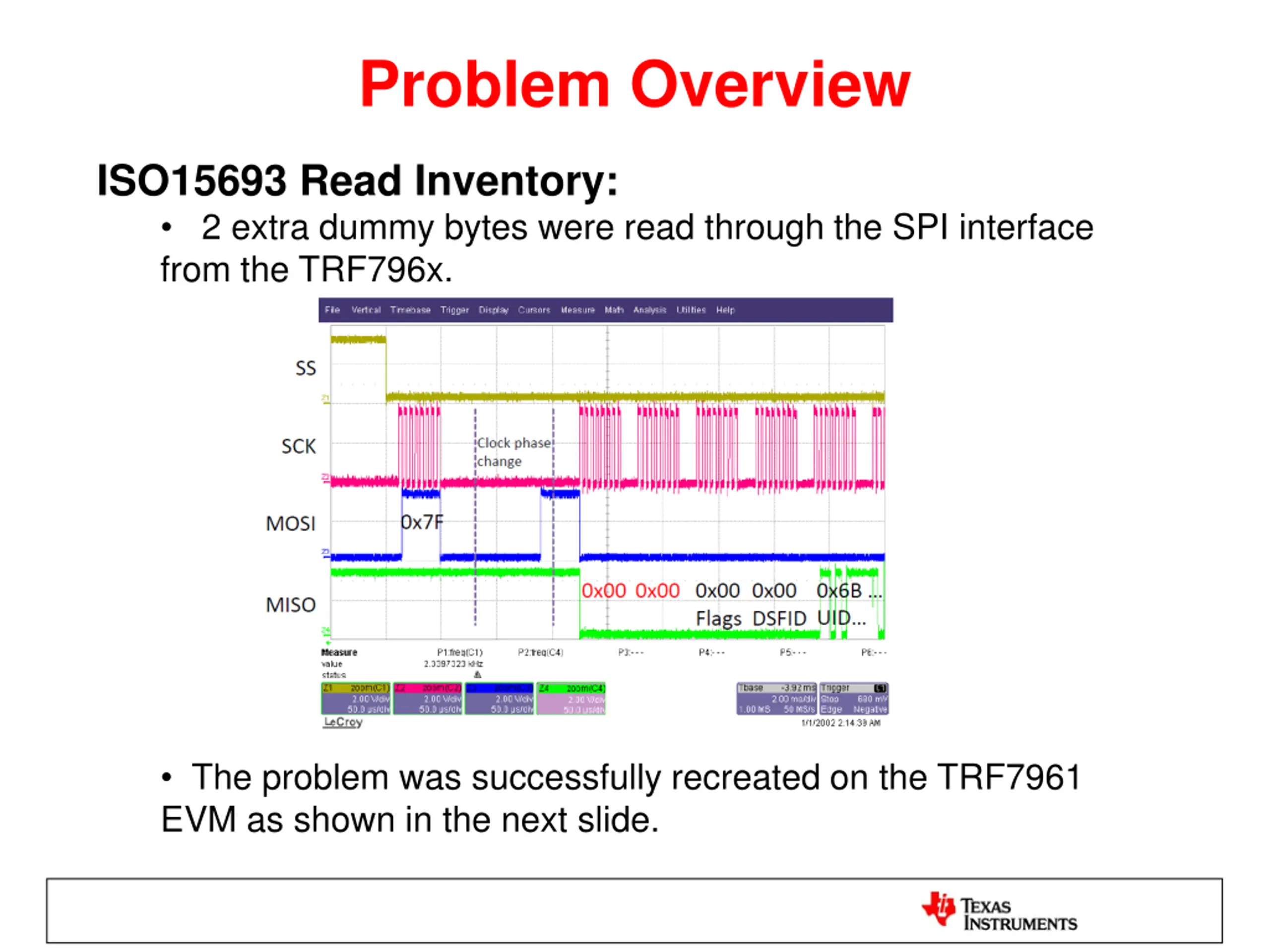 Problem Overview ISO15693 Read Inventory: 2 extra dummy bytes were read through the SPI interface from the TRF796x. The problem was successfully recreated on the TRF7961 EVM as shown in the next slide.