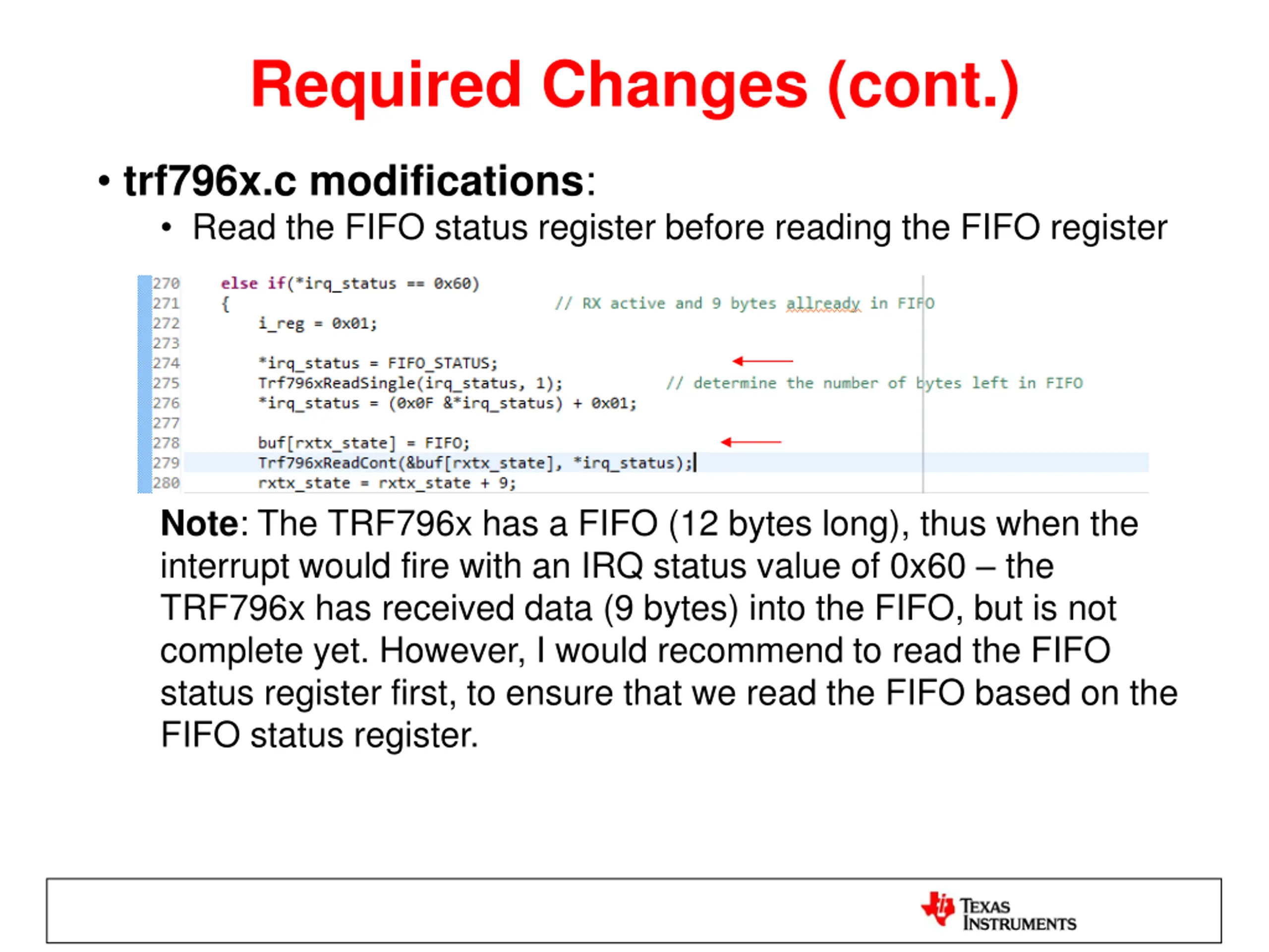 Required Changes (cont.) trf796x.c modifications: Read the FIFO status register before reading the FIFO register Note: The TRF796x has a FIFO (12 bytes long), thus when the interrupt would fire with an IRQ status value of 0x60 the TRF796x has received data (9 bytes) into the FIFO, but is not complete yet. However, I would recommend to read the FIFO status register first, to ensure that we read the FIFO based on the FIFO status register.