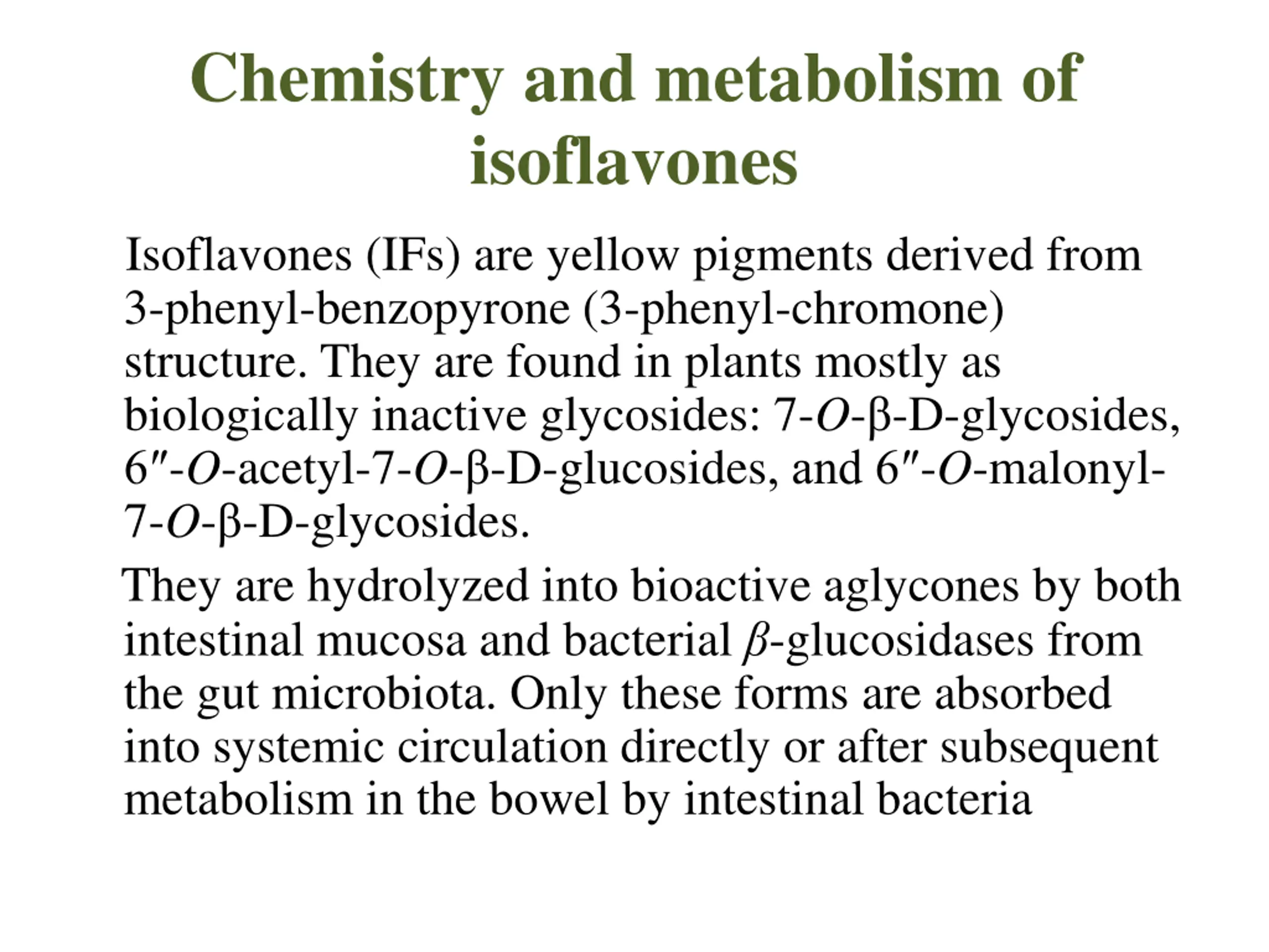 Chemistry and metabolism of isoflavones Isoflavones (IFs) are yellow pigments derived from 3-phenyl-benzopyrone (3-phenyl-chromone) structure. They are found in plants mostly as biologically inactive glycosides: 7-O- -D-glycosides, 6 -O-acetyl-7-O- -D-glucosides, and 6 -O-malonyl- 7-O- -D-glycosides. They are hydrolyzed into bioactive aglycones by both intestinal mucosa and bacterial -glucosidases from the gut microbiota. Only these forms are absorbed into systemic circulation directly or after subsequent metabolism in the bowel by intestinal bacteria