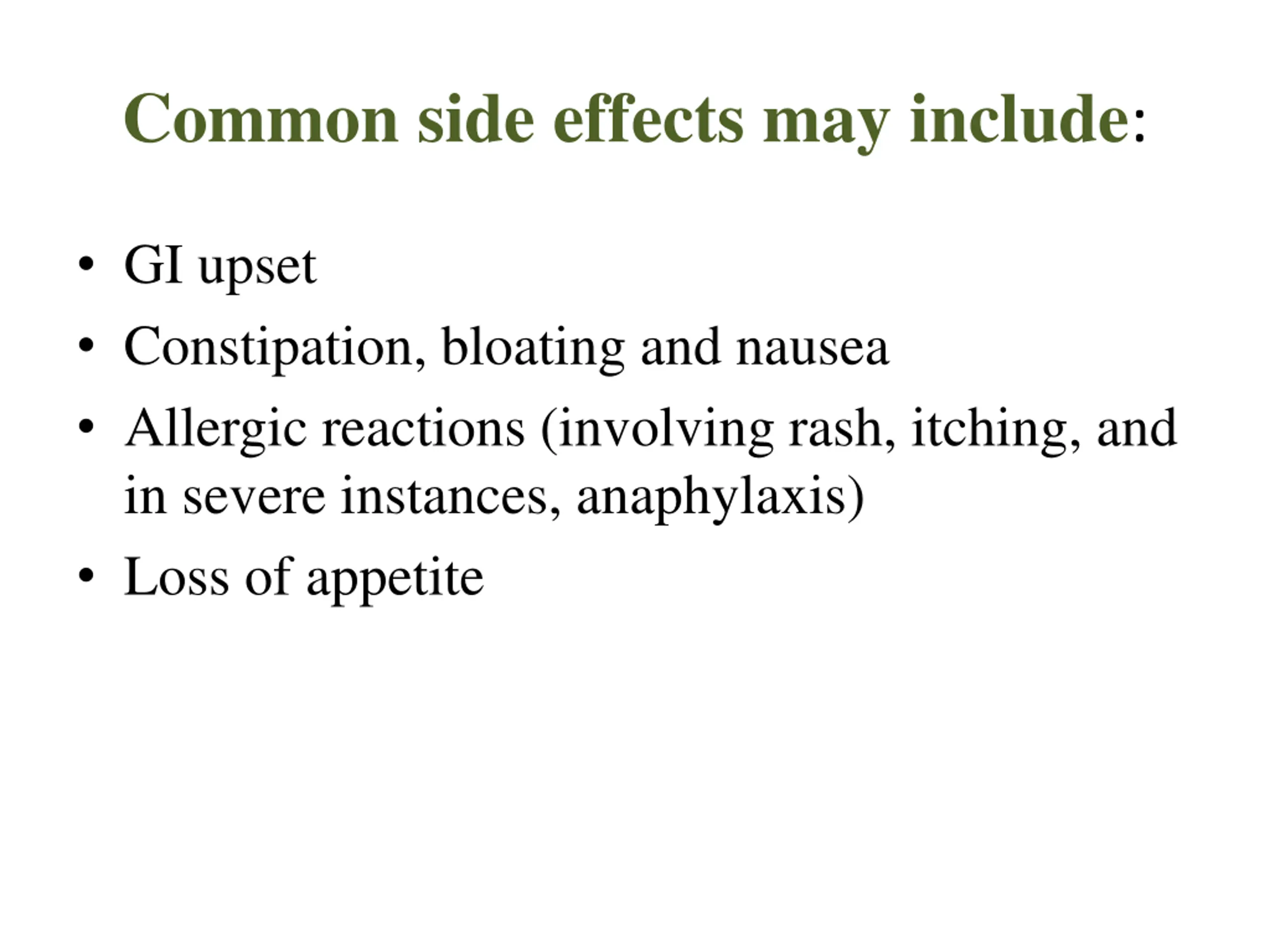 Common side effects may include: GI upset Constipation, bloating and nausea Allergic reactions (involving rash, itching, and in severe instances, anaphylaxis) Loss of appetite