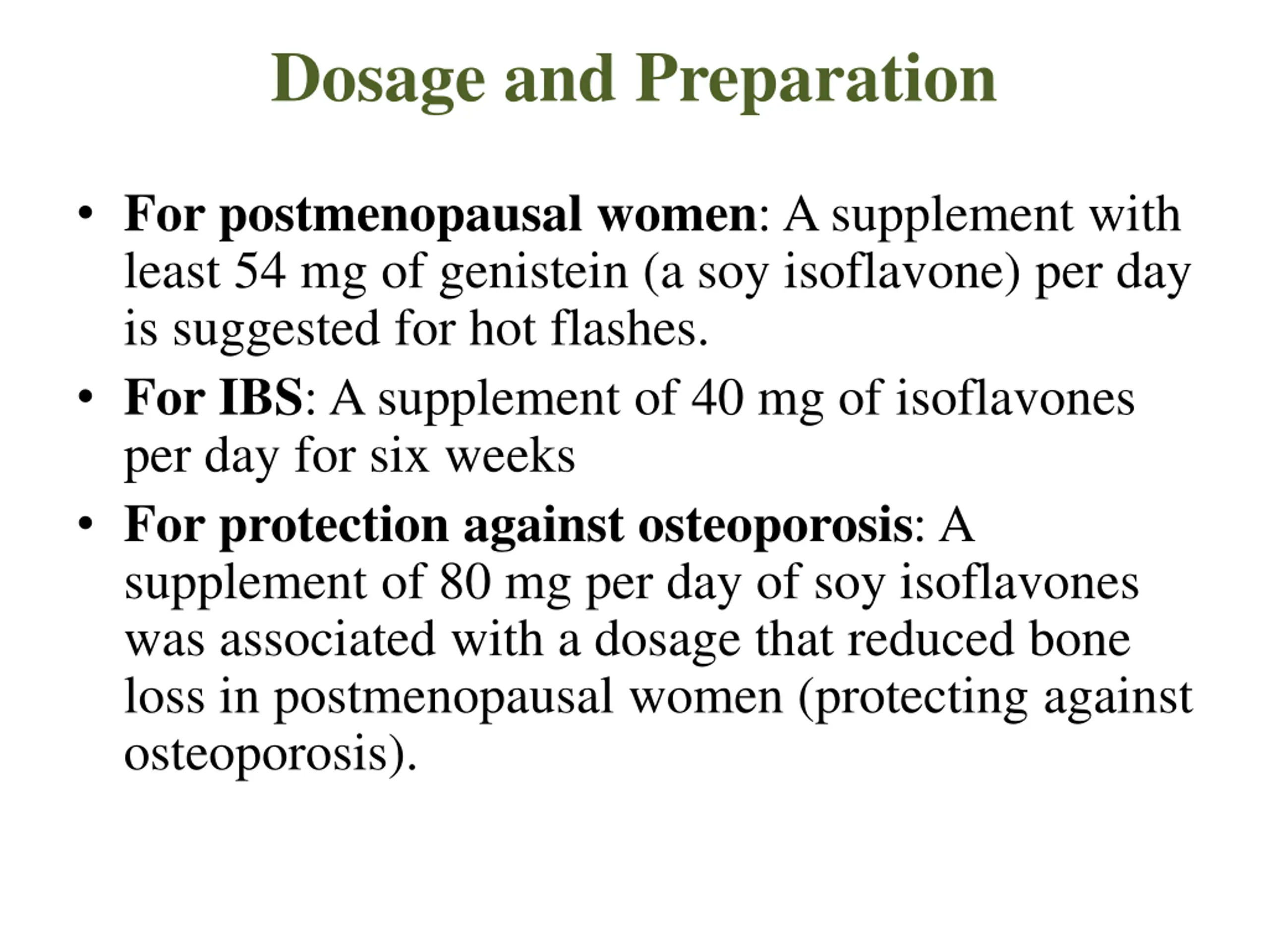 Dosage and Preparation For postmenopausal women: A supplement with least 54 mg of genistein (a soy isoflavone) per day is suggested for hot flashes. For IBS: A supplement of 40 mg of isoflavones per day for six weeks For protection against osteoporosis: A supplement of 80 mg per day of soy isoflavones was associated with a dosage that reduced bone loss in postmenopausal women (protecting against osteoporosis).