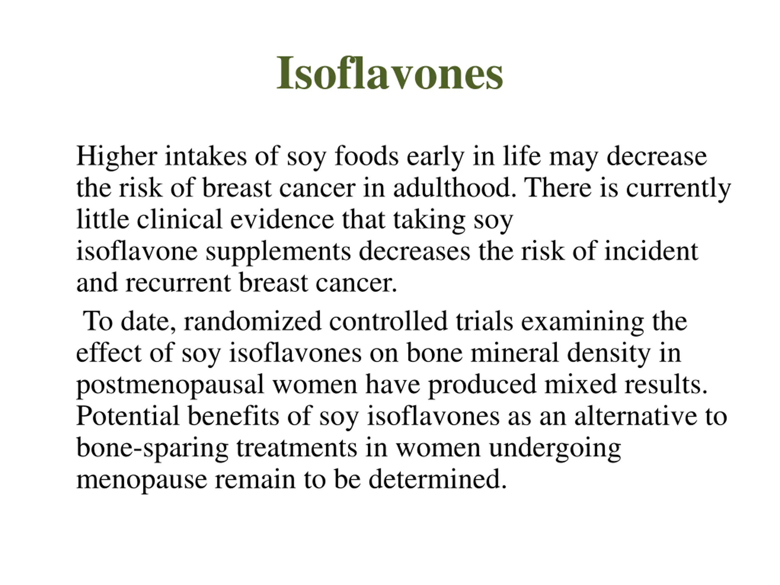 Isoflavones Higher intakes of soy foods early in life may decrease the risk of breast cancer in adulthood. There is currently little clinical evidence that taking soy isoflavone supplements decreases the risk of incident and recurrent breast cancer. To date, randomized controlled trials examining the effect of soy isoflavones on bone mineral density in postmenopausal women have produced mixed results. Potential benefits of soy isoflavones as an alternative to bone-sparing treatments in women undergoing menopause remain to be determined.
