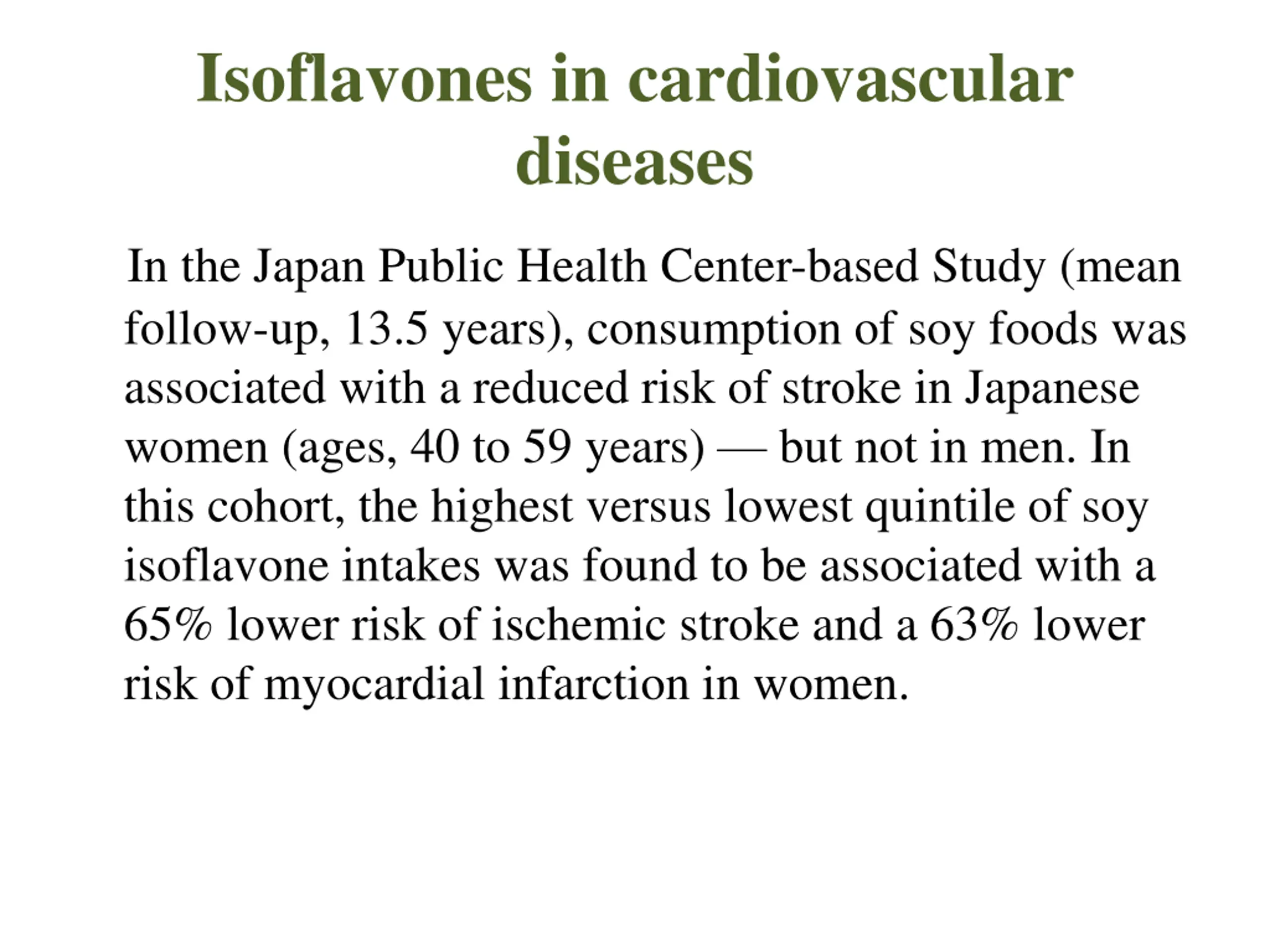 Isoflavones in cardiovascular diseases In the Japan Public Health Center-based Study (mean follow-up, 13.5 years), consumption of soy foods was associated with a reduced risk of stroke in Japanese women (ages, 40 to 59 years) but not in men. In this cohort, the highest versus lowest quintile of soy isoflavone intakes was found to be associated with a 65% lower risk of ischemic stroke and a 63% lower risk of myocardial infarction in women.