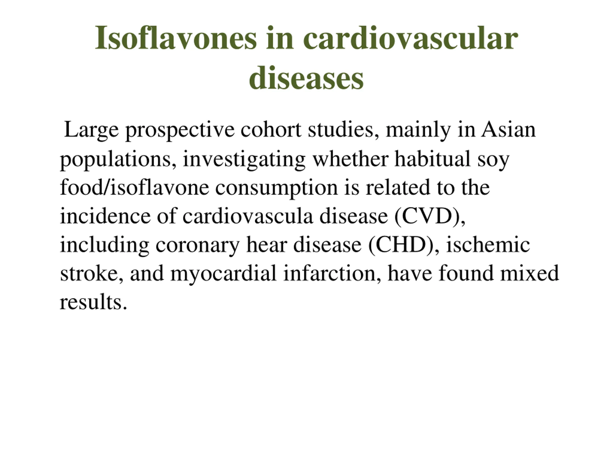 Isoflavones in cardiovascular diseases Large prospective cohort studies, mainly in Asian populations, investigating whether habitual soy food/isoflavone consumption is related to the incidence of cardiovascula disease (CVD), including coronary hear disease (CHD), ischemic stroke, and myocardial infarction, have found mixed results.