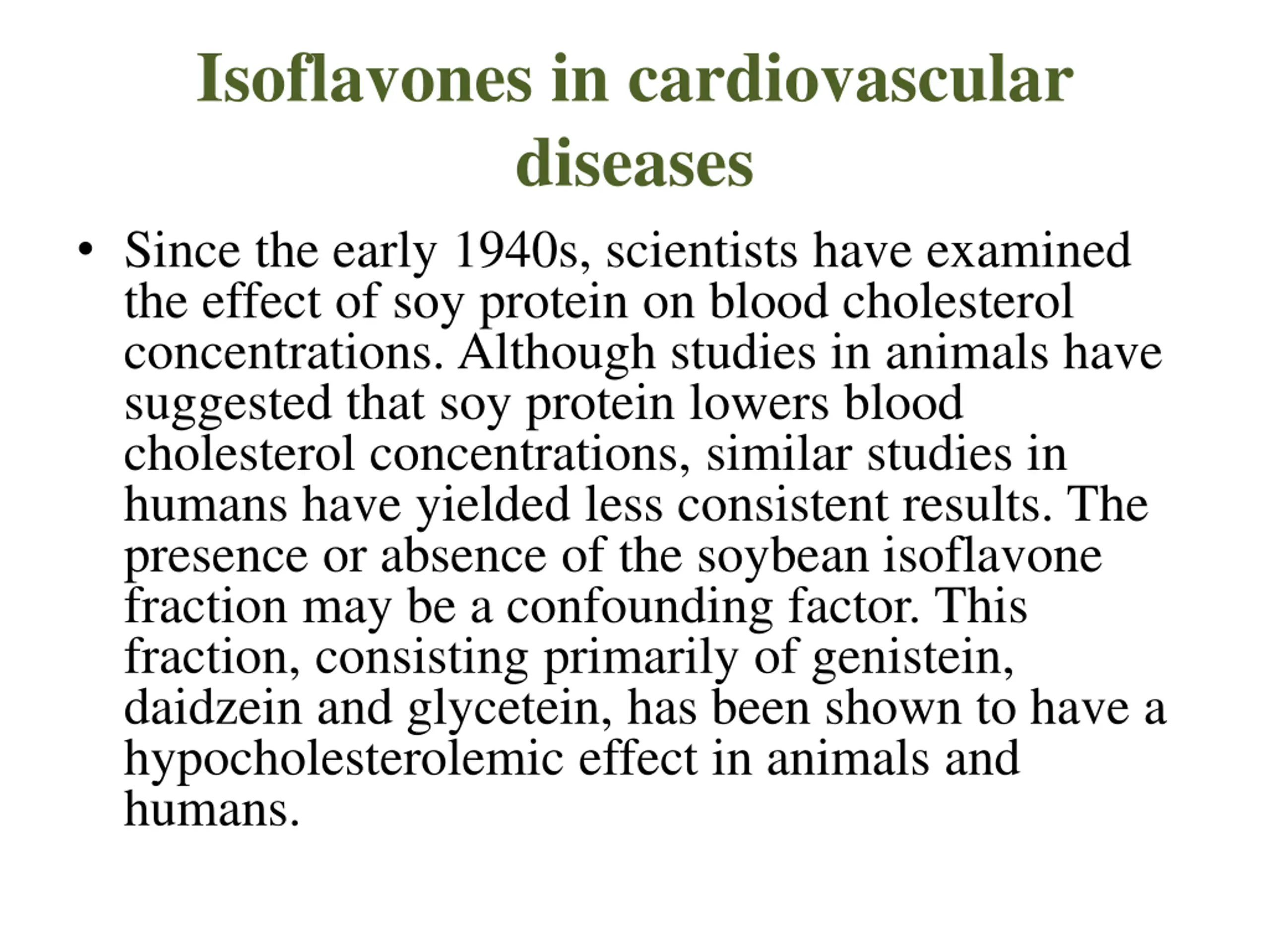 Isoflavones in cardiovascular diseases Since the early 1940s, scientists have examined the effect of soy protein on blood cholesterol concentrations. Although studies in animals have suggested that soy protein lowers blood cholesterol concentrations, similar studies in humans have yielded less consistent results. The presence or absence of the soybean isoflavone fraction may be a confounding factor. This fraction, consisting primarily of genistein, daidzein and glycetein, has been shown to have a hypocholesterolemic effect in animals and humans.