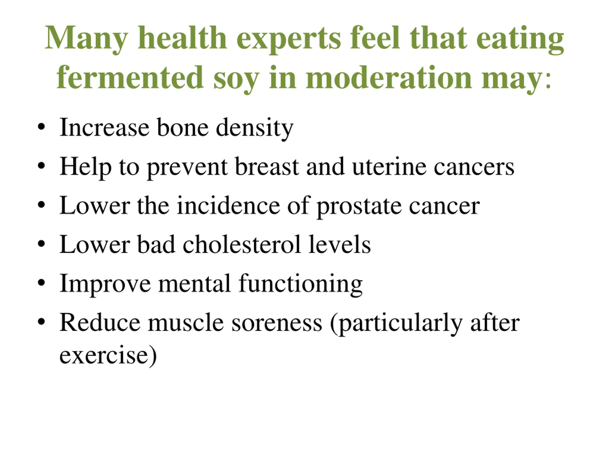 Many health experts feel that eating fermented soy in moderation may: Increase bone density Help to prevent breast and uterine cancers Lower the incidence of prostate cancer Lower bad cholesterol levels Improve mental functioning Reduce muscle soreness (particularly after exercise)