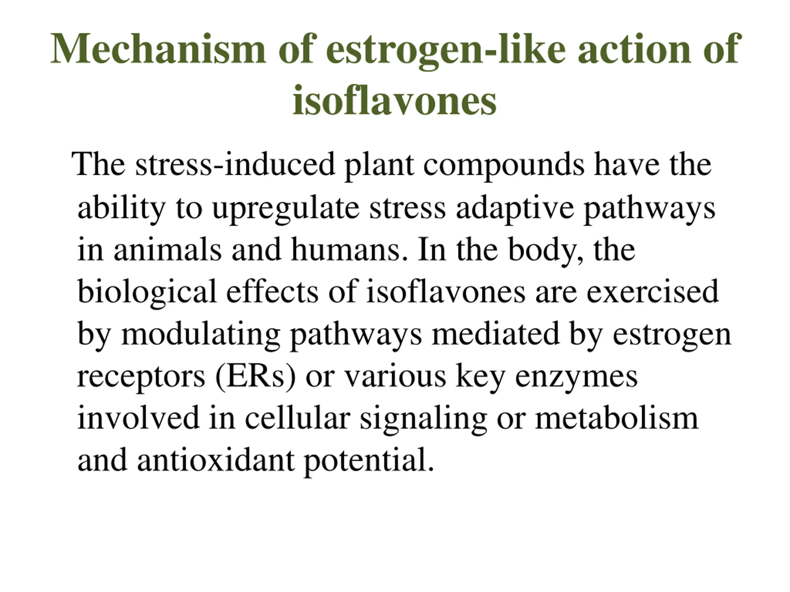 Mechanism of estrogen-like action of isoflavones The stress-induced plant compounds have the ability to upregulate stress adaptive pathways in animals and humans. In the body, the biological effects of isoflavones are exercised by modulating pathways mediated by estrogen receptors (ERs) or various key enzymes involved in cellular signaling or metabolism and antioxidant potential.