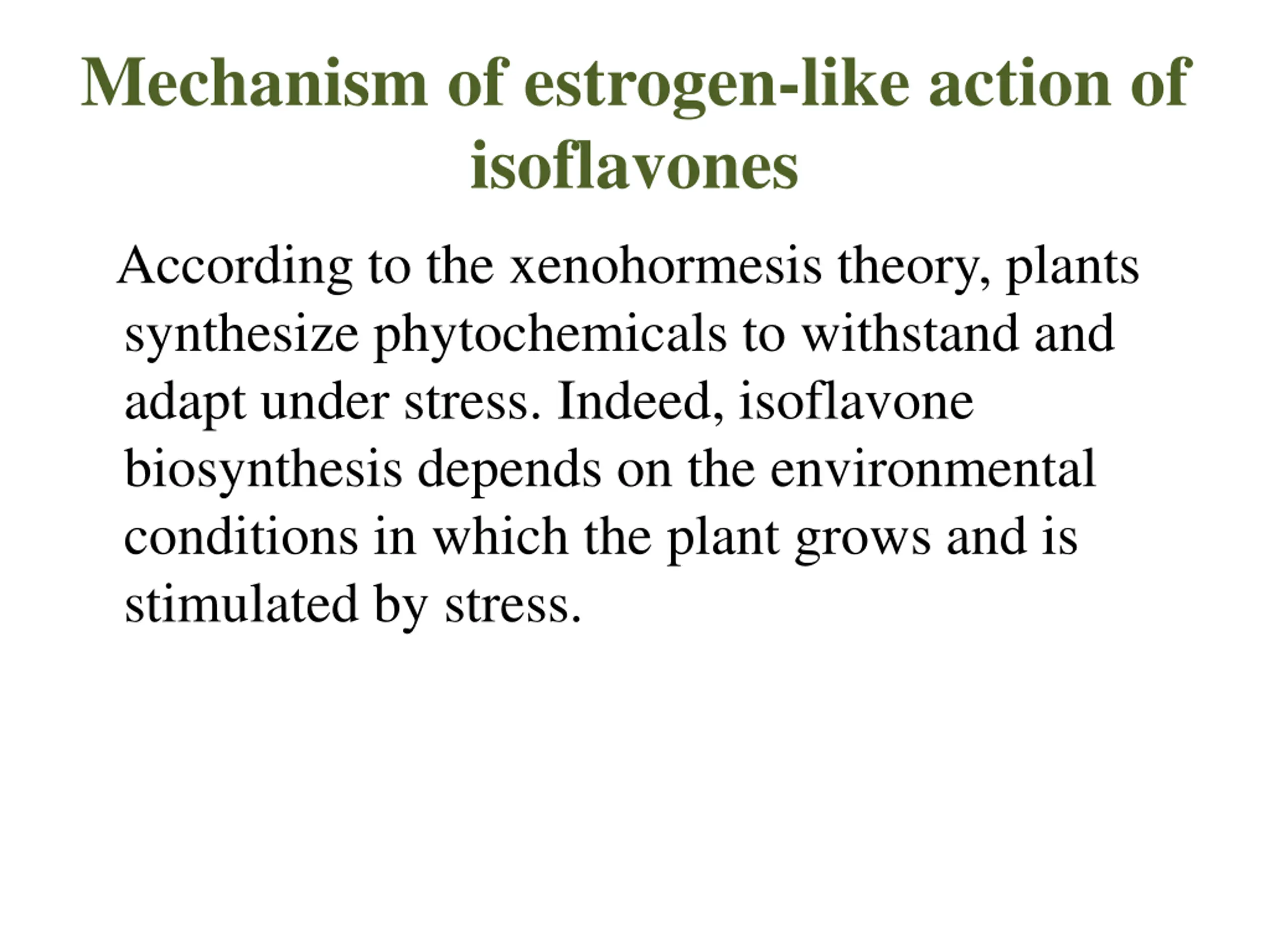Mechanism of estrogen-like action of isoflavones According to the xenohormesis theory, plants synthesize phytochemicals to withstand and adapt under stress. Indeed, isoflavone biosynthesis depends on the environmental conditions in which the plant grows and is stimulated by stress.