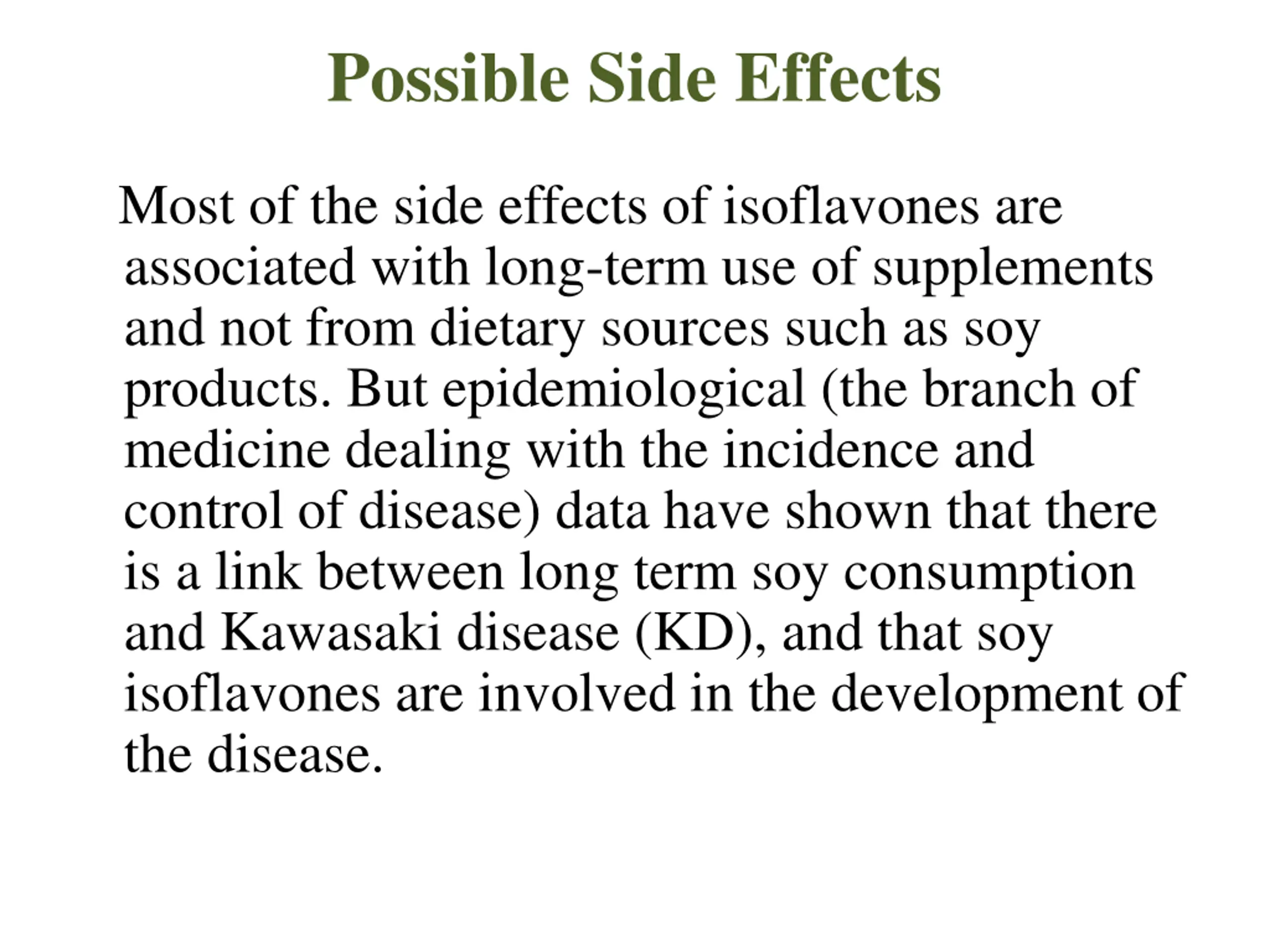 Possible Side Effects Most of the side effects of isoflavones are associated with long-term use of supplements and not from dietary sources such as soy products. But epidemiological (the branch of medicine dealing with the incidence and control of disease) data have shown that there is a link between long term soy consumption and Kawasaki disease (KD), and that soy isoflavones are involved in the development of the disease.