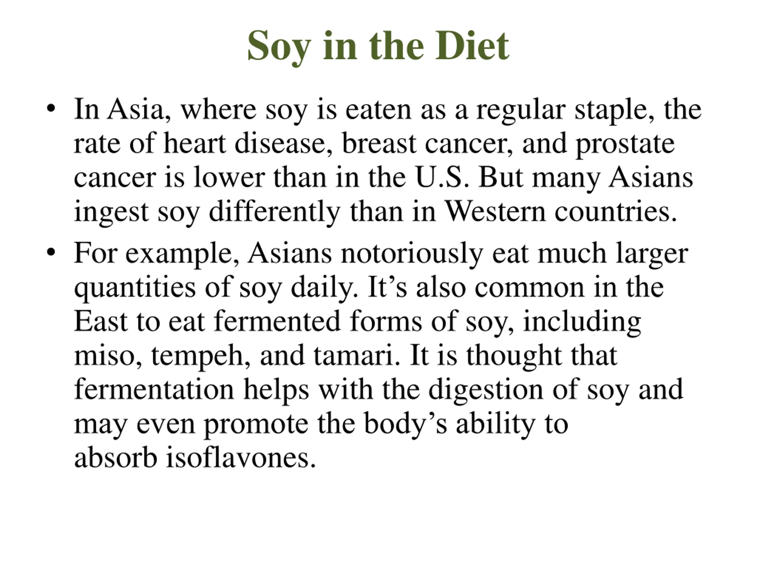 Soy in the Diet In Asia, where soy is eaten as a regular staple, the rate of heart disease, breast cancer, and prostate cancer is lower than in the U.S. But many Asians ingest soy differently than in Western countries. For example, Asians notoriously eat much larger quantities of soy daily. It s also common in the East to eat fermented forms of soy, including miso, tempeh, and tamari. It is thought that fermentation helps with the digestion of soy and may even promote the body s ability to absorb isoflavones.
