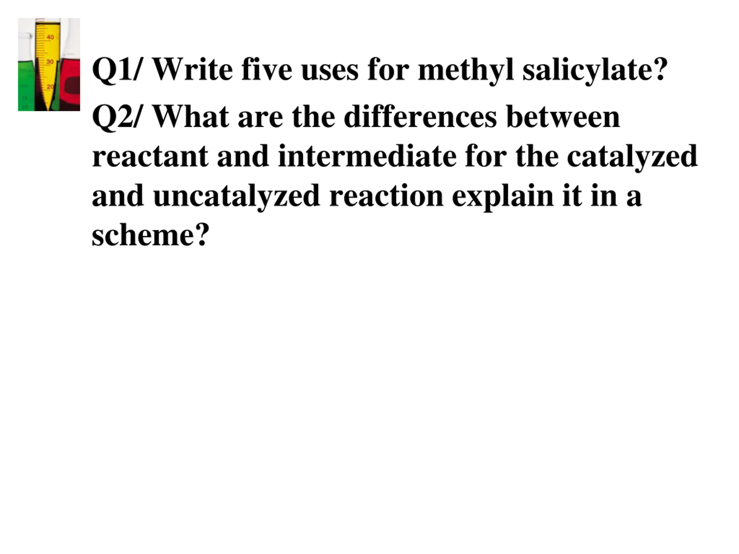 Q1/ Write five uses for methyl salicylate? Q2/ What are the differences between reactant and intermediate for the catalyzed and uncatalyzed reaction explain it in a scheme?
