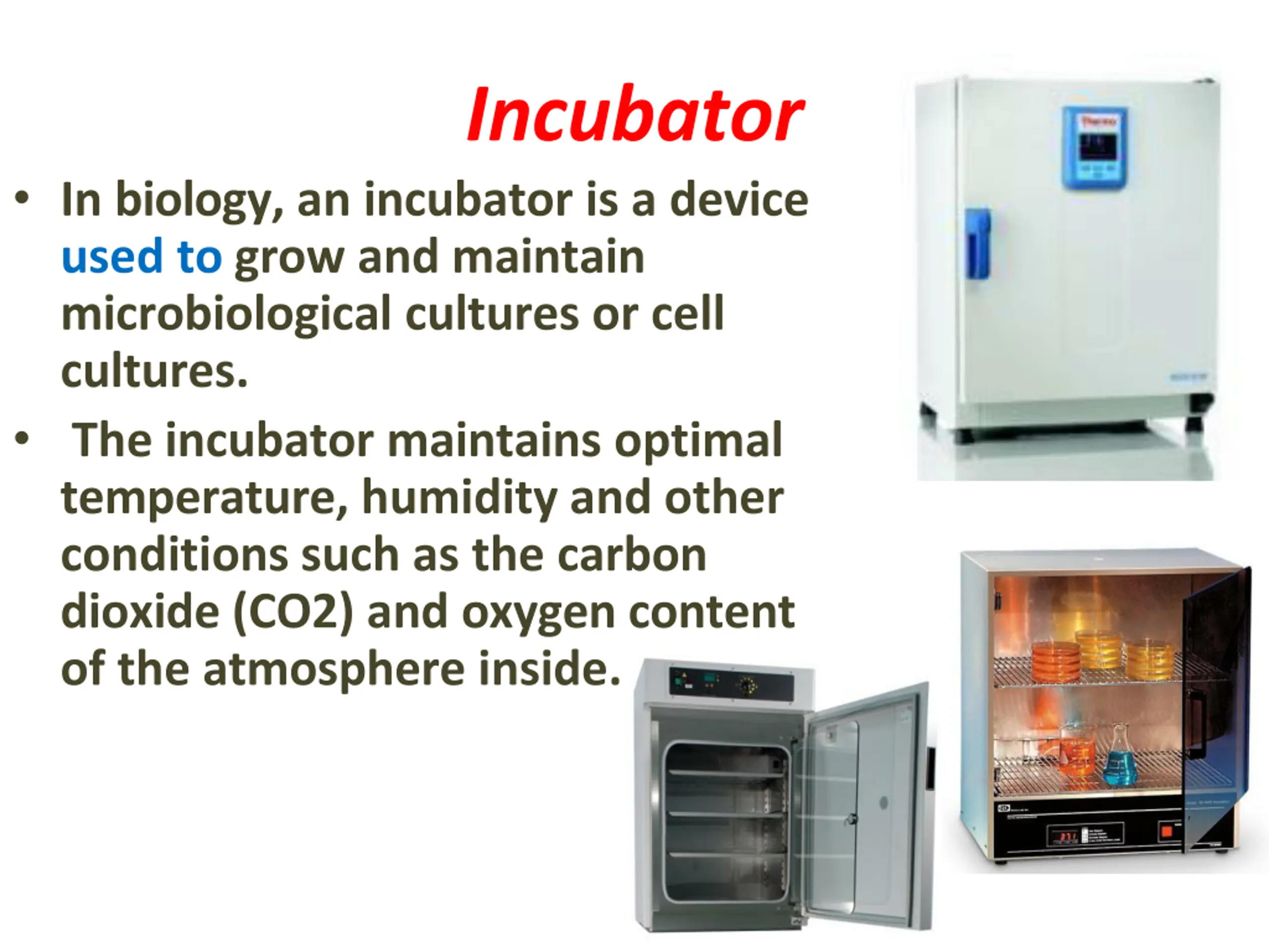 Incubator In biology, an incubator is a device used to grow and maintain microbiological cultures or cell cultures. The incubator maintains optimal temperature, humidity and other conditions such as the carbon dioxide (CO2) and oxygen content of the atmosphere inside.