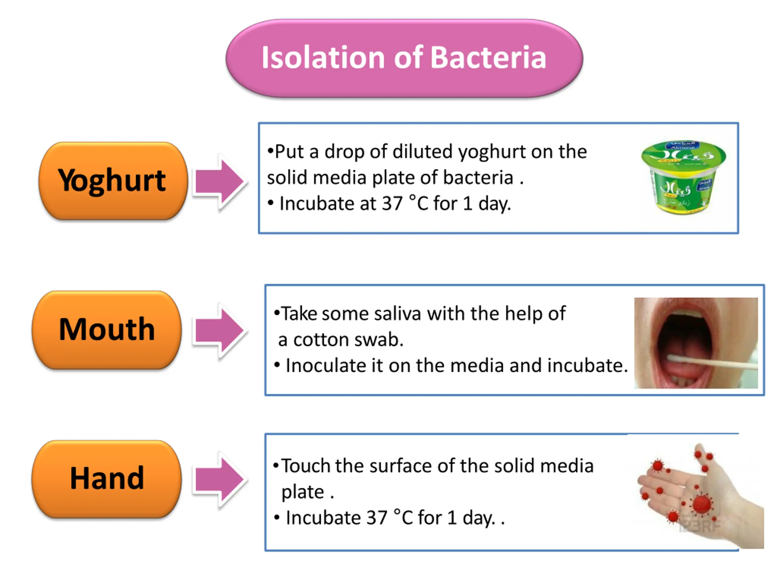 Isolation ofBacteria Put a drop of diluted yoghurt on the solid media plate of bacteria . Incubate at 37 C for 1 day. Yoghurt Take some saliva with the help of a cotton swab. Inoculate it on the media and incubate. Mouth Touch the surface of the solid media plate . Incubate 37 C for 1 day.. Hand