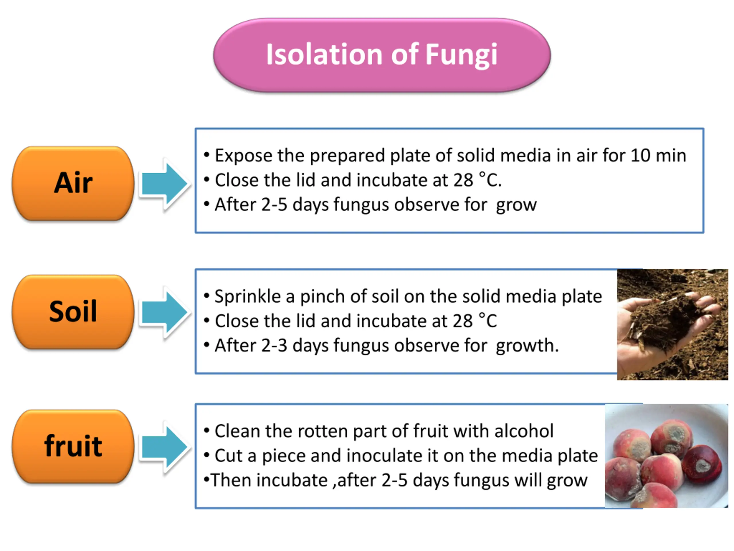 Isolation ofFungi Expose the prepared plate of solid media in air for 10 min Close the lid and incubate at 28 C. After 2-5 days fungus observe for grow Air Sprinkle a pinch of soil on the solid media plate Close the lid and incubate at 28 C After 2-3 days fungus observe for growth. Soil Clean the rotten part of fruit with alcohol Cut a piece and inoculate it on the media plate Then incubate ,after 2-5 days fungus will grow fruit