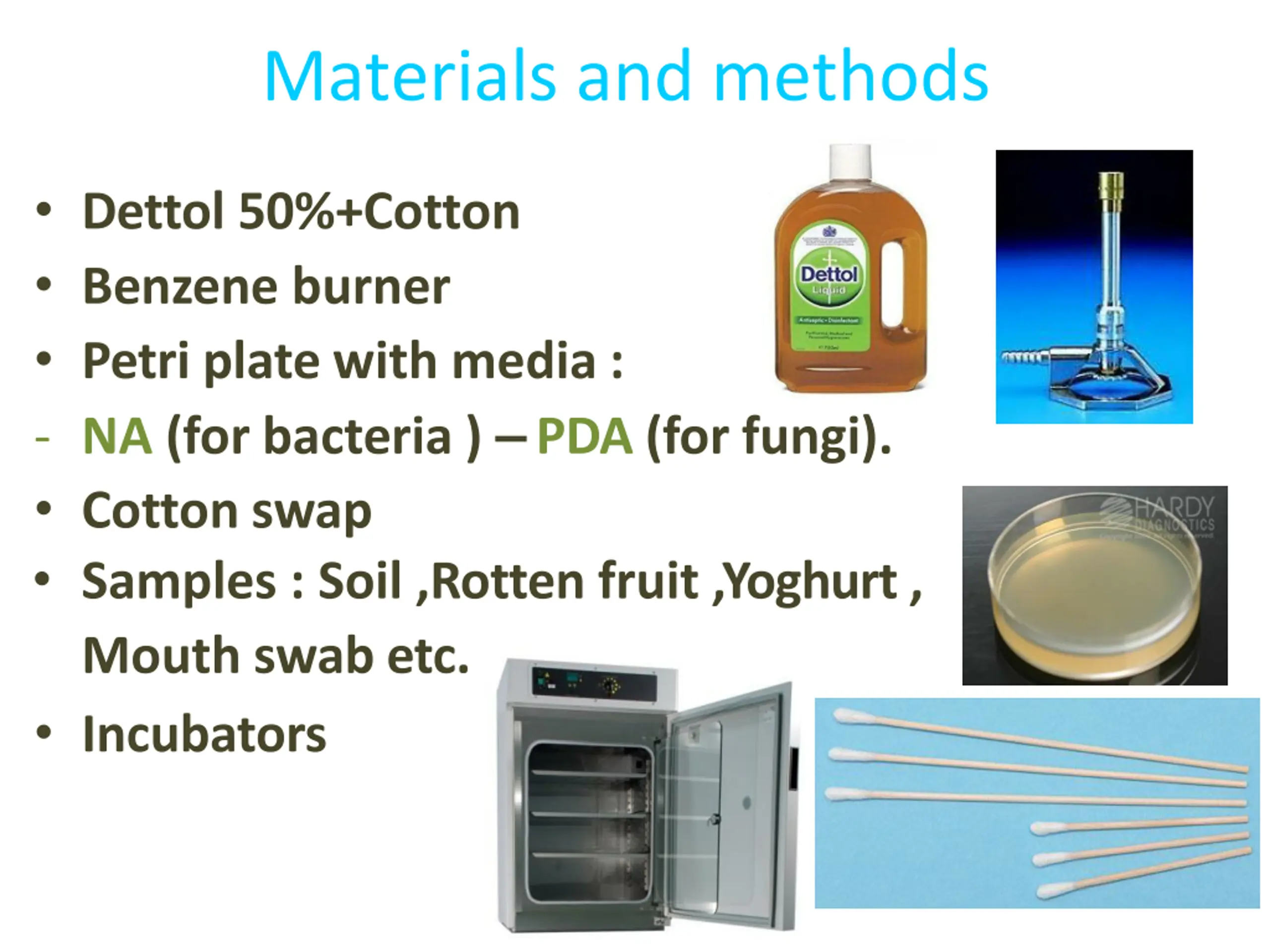 Materials and methods Dettol 50%+Cotton Benzene burner Petri plate with media : - NA (for bacteria ) PDA (for fungi). Cotton swap Samples : Soil ,Rotten fruit ,Yoghurt , Mouth swab etc. Incubators