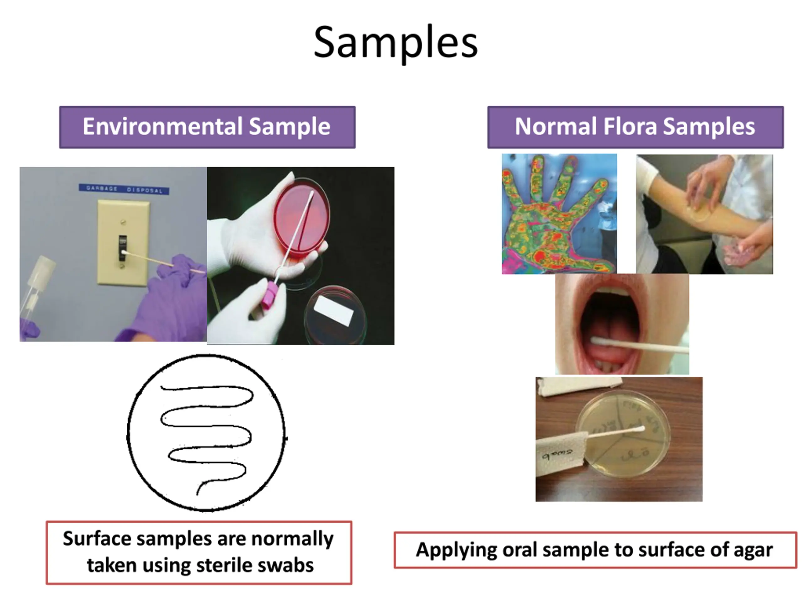 Samples Environmental Sample Normal FloraSamples Surface samples arenormally taken using sterile swabs Applying oral sample to surface ofagar