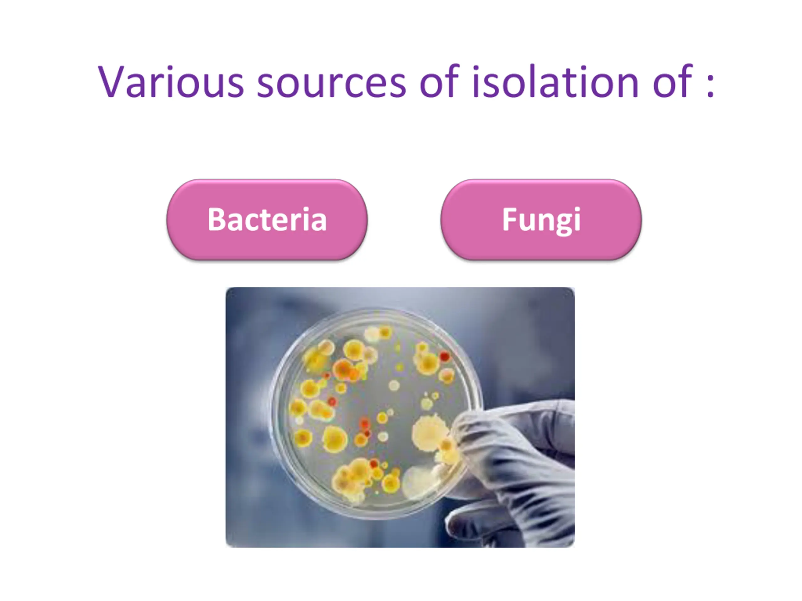 Various sources of isolation of : Bacteria Fungi