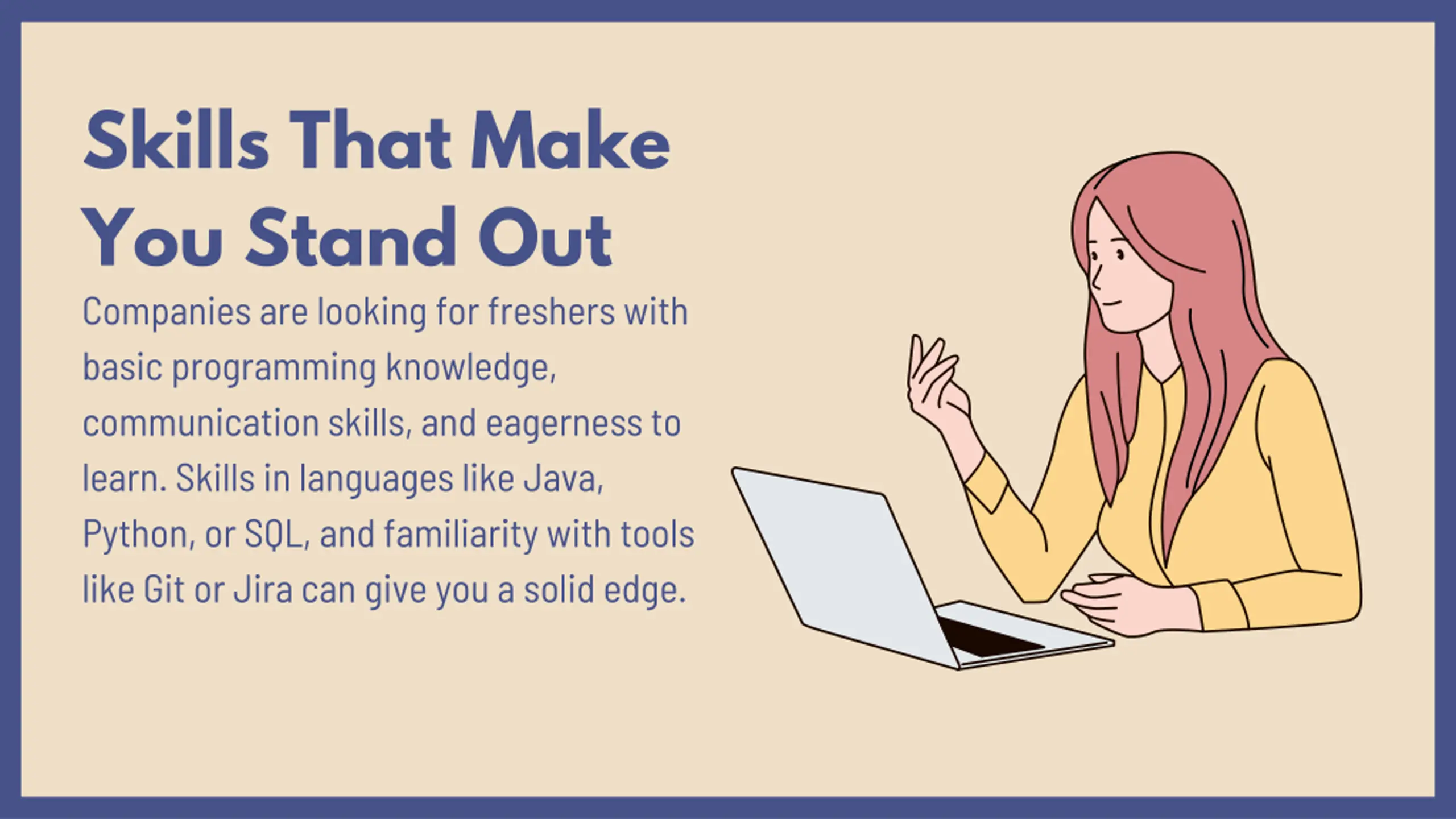 Skills That Make You Stand Out Companies are looking for freshers with basic programming knowledge, communication skills, and eagerness to learn. Skills in languages like Java, Python, or SQL, and familiarity with tools like Git or Jira can give you a solid edge.
