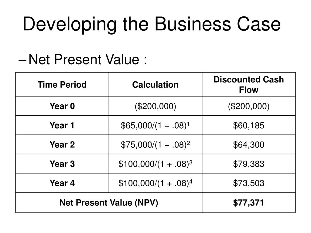 Developing the Business Case Net Present Value : Discounted Cash Flow Time Period Calculation ($200,000) ($200,000) Year 0 $65,000/(1 + .08)1 $60,185 Year 1 $75,000/(1 + .08)2 $64,300 Year 2 $100,000/(1 + .08)3 $79,383 Year 3 $100,000/(1 + .08)4 $73,503 Year 4 Net Present Value (NPV) $77,371