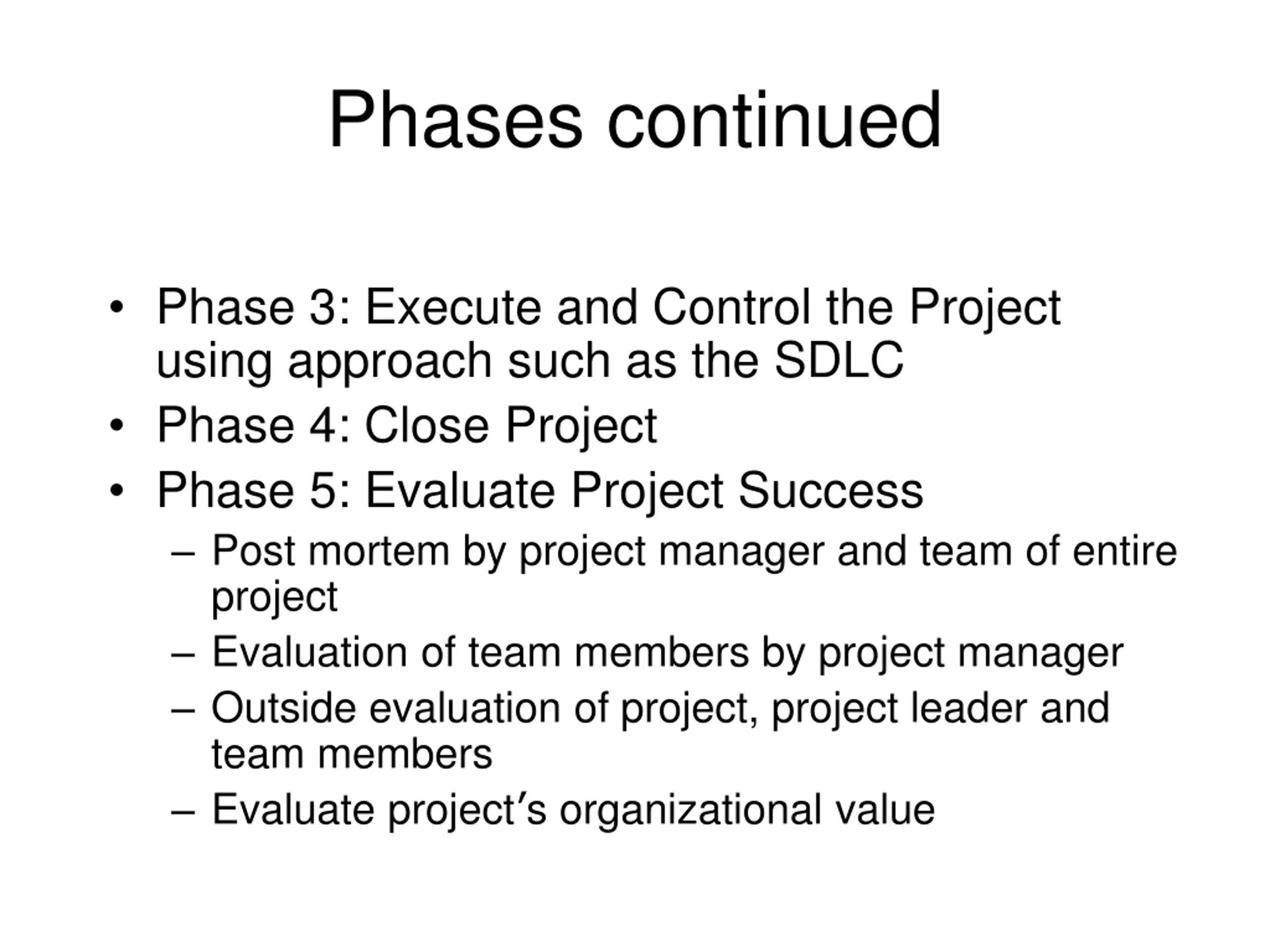 Phases continued Phase 3: Execute and Control the Project using approach such as the SDLC Phase 4: Close Project Phase 5: Evaluate Project Success Post mortem by project manager and team of entire project Evaluation of team members by project manager Outside evaluation of project, project leader and team members Evaluate project s organizational value
