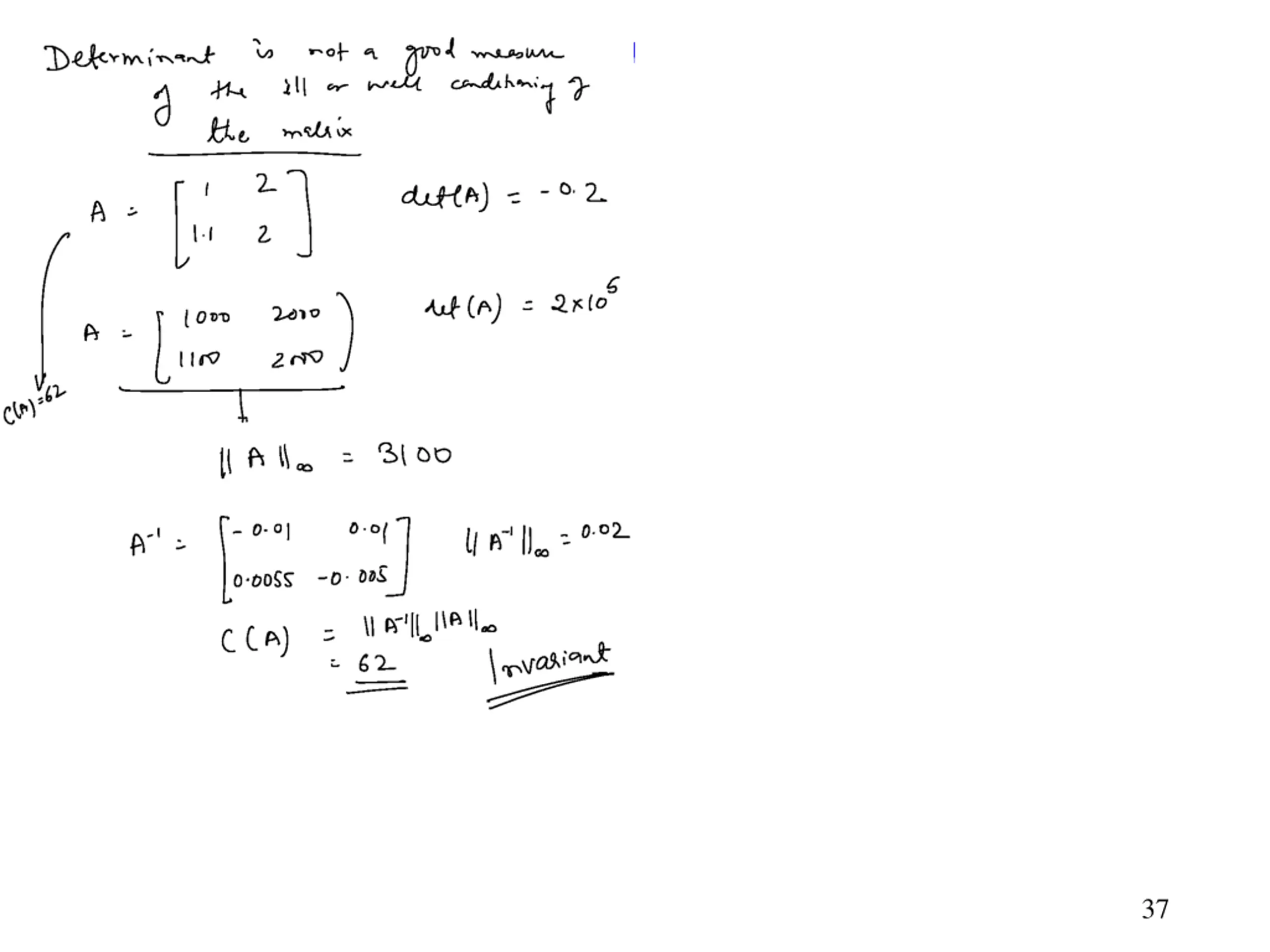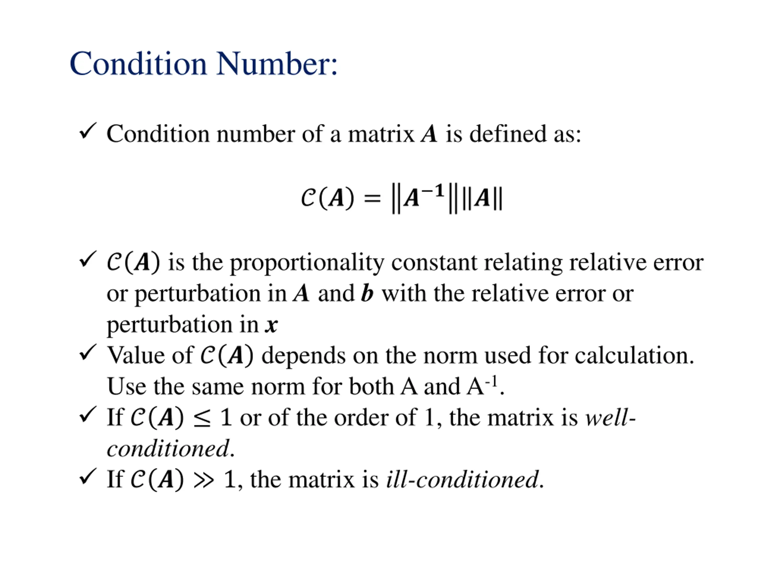 Condition Number: Condition number of a matrix A is defined as: ? ? = ? ? ? ? ?is the proportionality constant relating relative error or perturbation in A and b with the relative error or perturbation in x Value of ? ? depends on the norm used for calculation. Use the same norm for both A and A-1. If ? ? 1 or of the order of 1, the matrix is well- conditioned. If ? ? 1, the matrix is ill-conditioned.