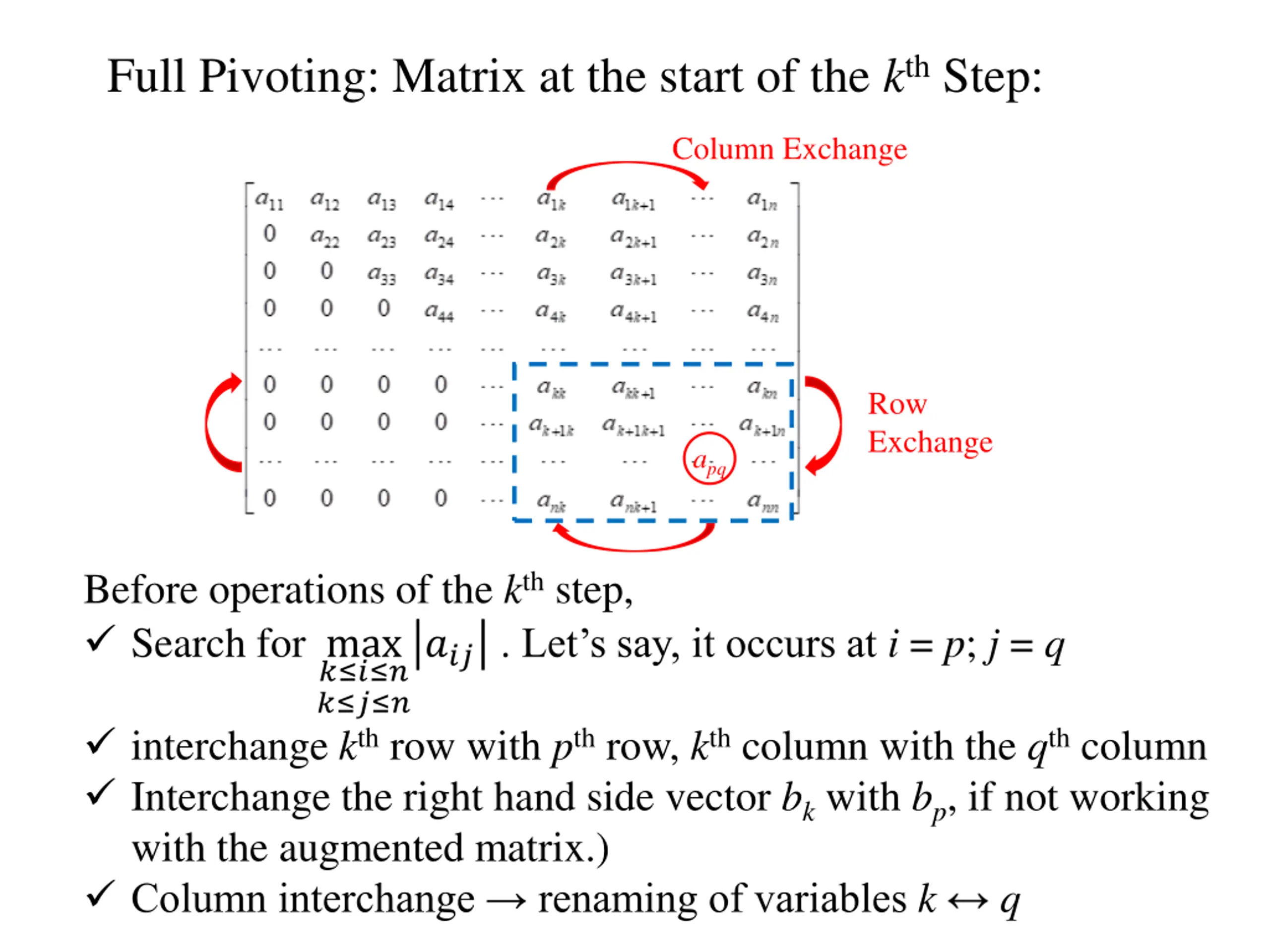 Full Pivoting: Matrix at the start of the kth Step: Column Exchange Row Exchange apq Before operations of the kth step, Search for max ? ? ? ? ? ? interchange kth row with pth row, kth column with the qth column Interchange the right hand side vector bk with bp, if not working with the augmented matrix.) Column interchange renaming of variables k ???. Let s say, it occurs at i = p; j = q q