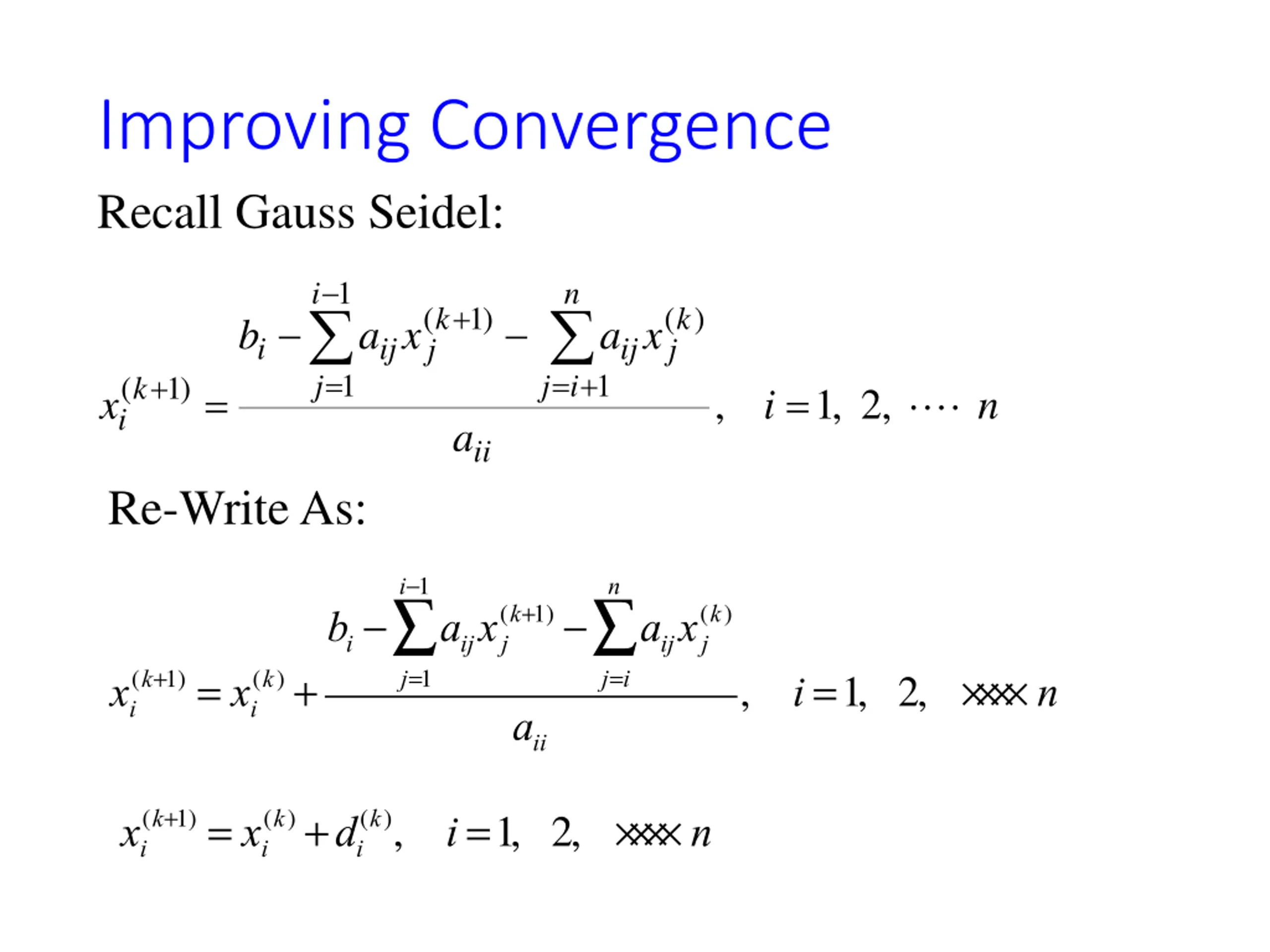 Improving Convergence Recall Gauss Seidel: 1 i = n = ) 1 + ( ( ) k k b a x a 1 x i ij ij j j + ) 1 + 1 j j i ( k = , 1 = , , 2 x i n i a ii Re-Write As: i-1 n (k+1)- bi- (k) aijxj aijxj j=1 j=i (k+1)= xi (k)+ , i =1, 2, n xi aii (k+1)= xi (k)+di (k), i=1, 2, n xi