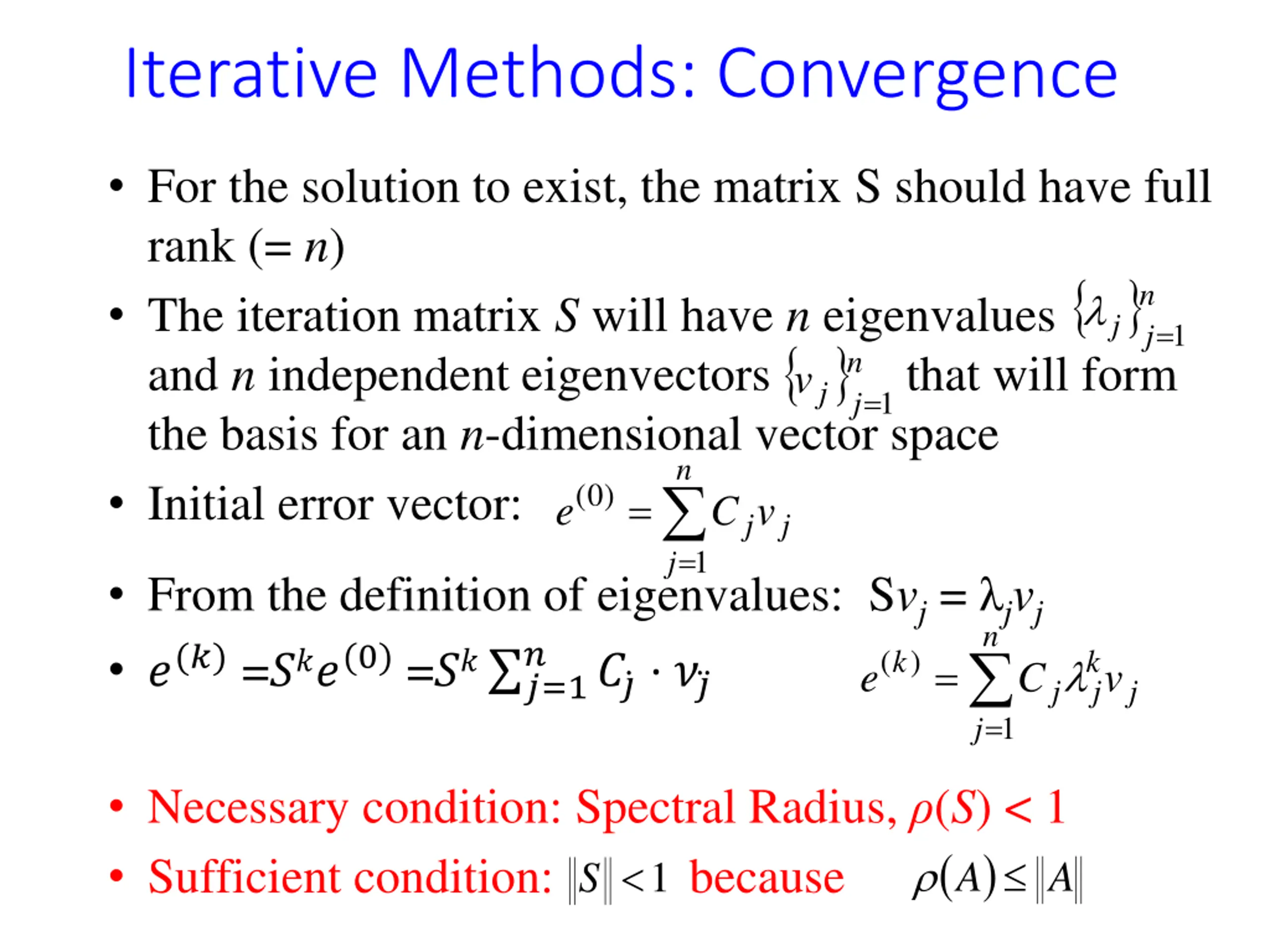 Iterative Methods: Convergence For the solution to exist, the matrix S should have full rank (= n) The iteration matrix S will have n eigenvalues and n independent eigenvectors that will form the basis for an n-dimensional vector space Initial error vector: e n j = 1 j n j v = 1 j n ) 0 ( = C jv j = 1 j From the definition of eigenvalues: Svj = jvj ?(?) =???(0)=?? ?=1 n = ? ( ) k k j ? ? ? ? = e C v j j 1 j Necessary condition: Spectral Radius, (S) < 1 Sufficient condition: because S ( ) A A 1