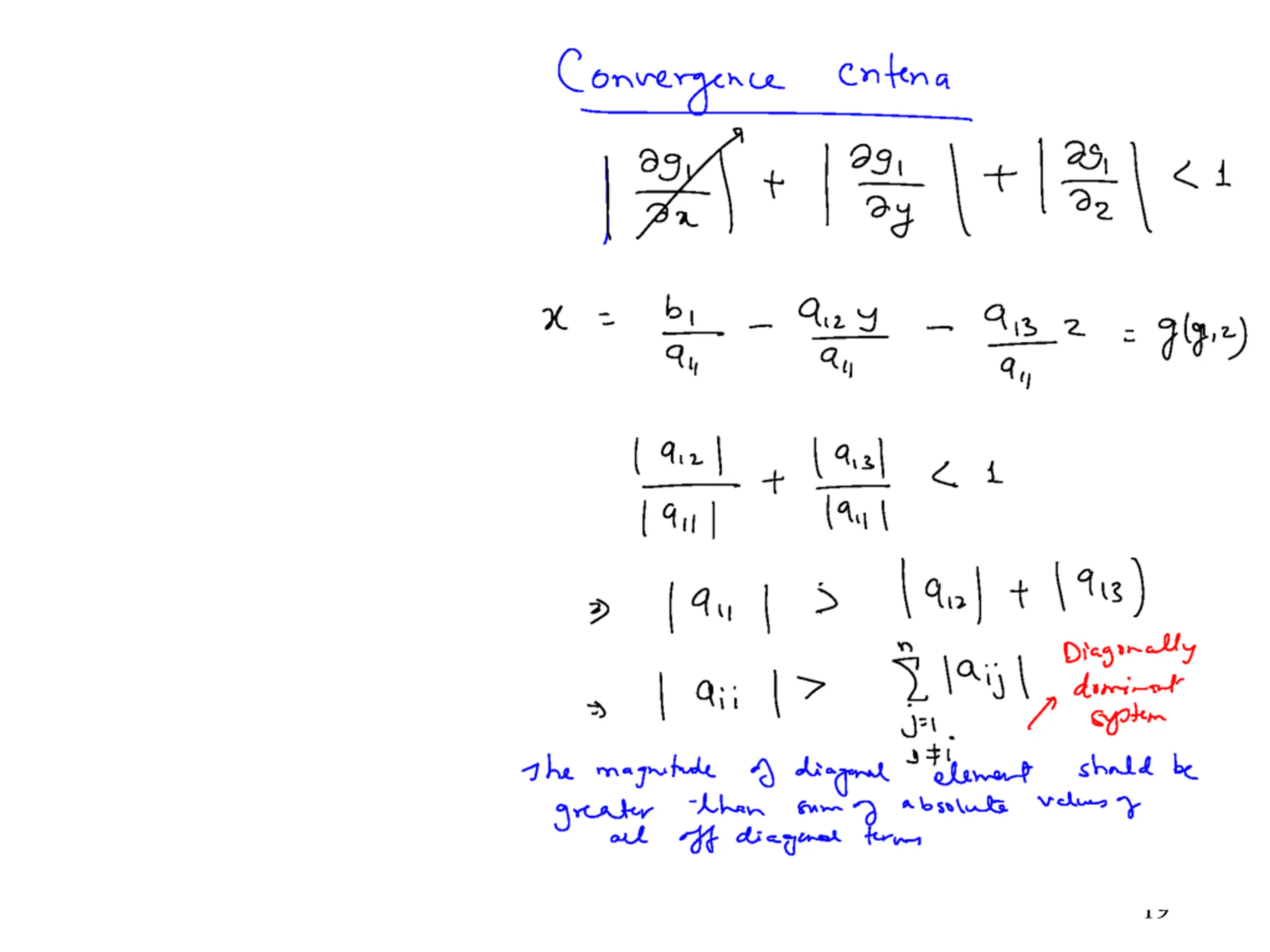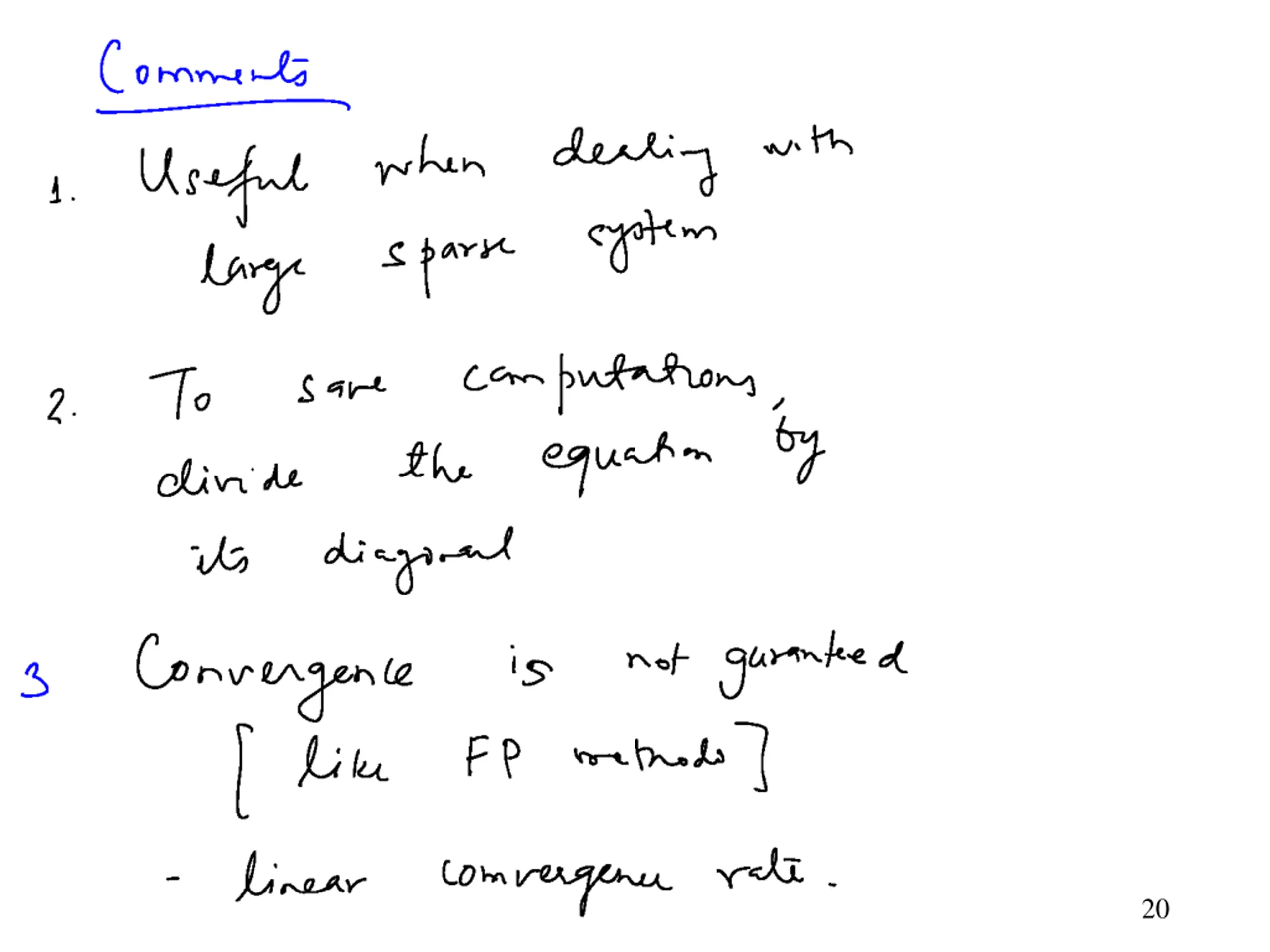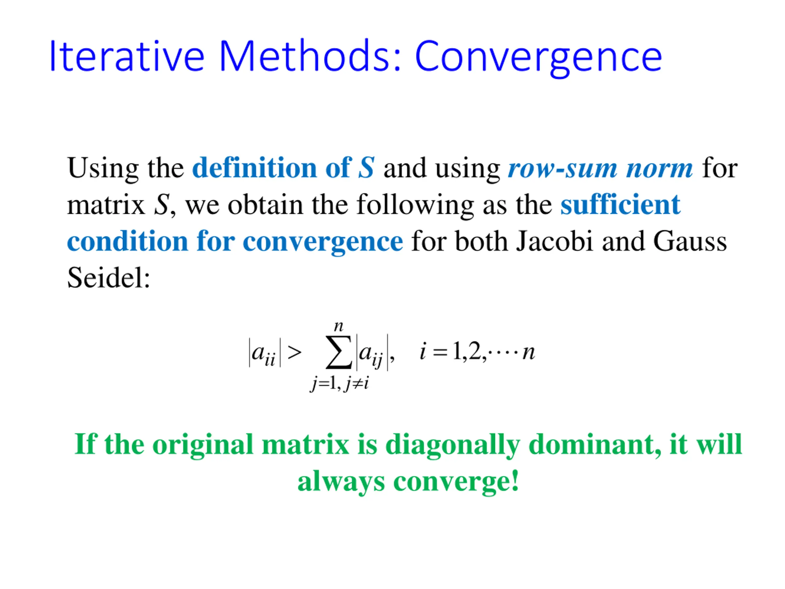 Iterative Methods: Convergence Using the definition of S and using row-sum norm for matrix S, we obtain the following as the sufficient condition for convergence for both Jacobi and Gauss Seidel: n = = , , 2 , 1 a a i i n ii ij , 1 j j If the original matrix is diagonally dominant, it will always converge!