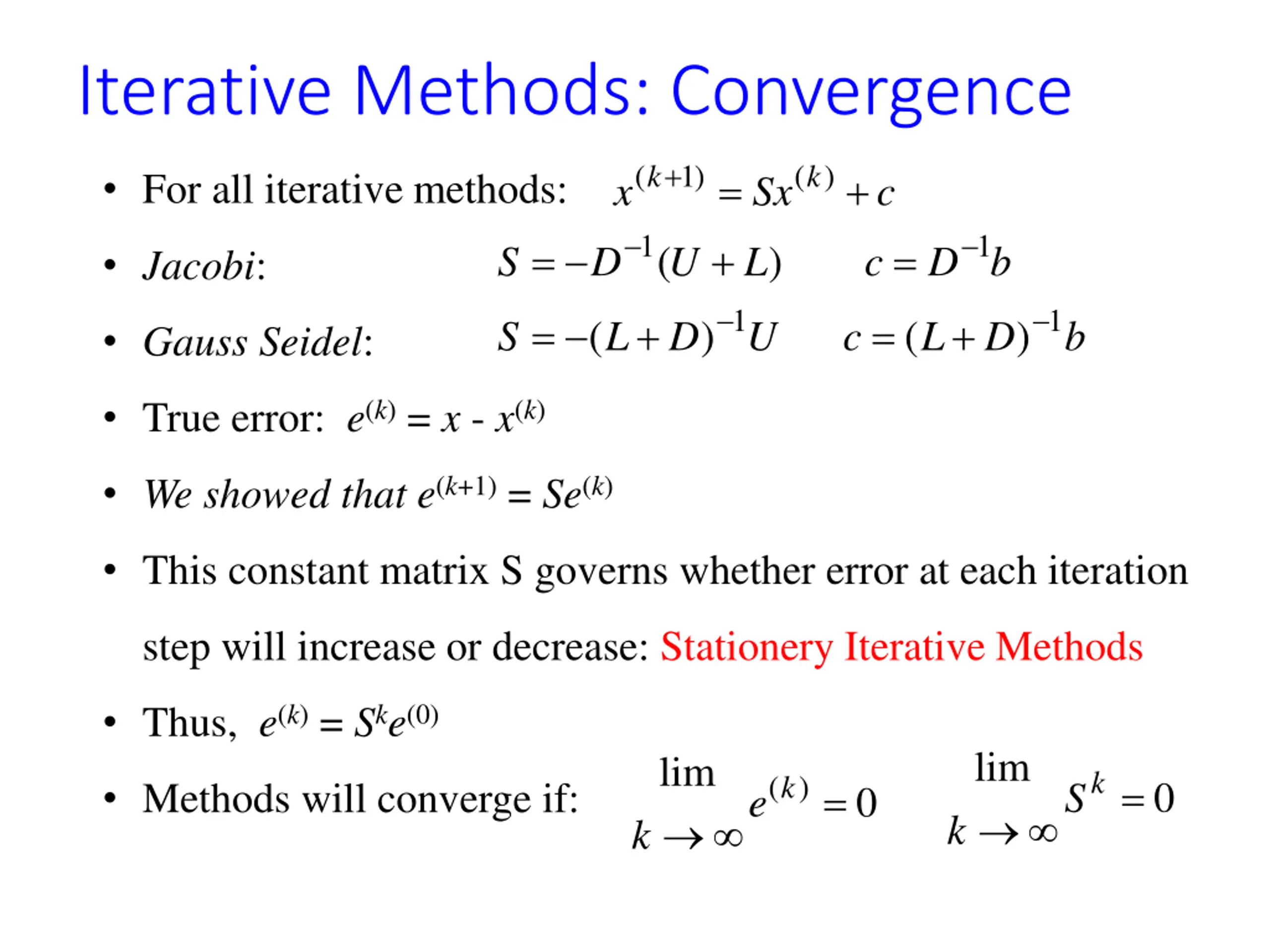 Iterative Methods: Convergence + ( ) 1 ( ) k k = + For all iterative methods: x Sx c 1 1 = + = U ( ) S D L c D b Jacobi: 1 1 = + = + ( ) ( ) S L D U c L D b Gauss Seidel: True error: e(k) = x- x(k) We showed that e(k+1) = Se(k) This constant matrix S governs whether error at each iteration step will increase or decrease: Stationery Iterative Methods Thus, e(k) = Ske(0) lim lim k ( ) k = 0 Methods will converge if: S = 0 e k k