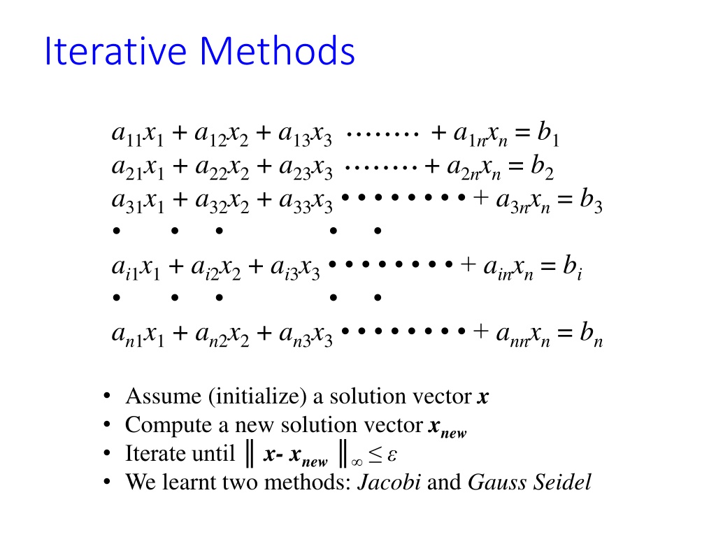 Iterative Methods a11x1 + a12x2 + a13x3 + a1nxn = b1 a21x1 + a22x2 + a23x3 + a2nxn = b2 a31x1 + a32x2 + a33x3 + a3nxn = b3 ai1x1 + ai2x2 + ai3x3 + ainxn = bi an1x1 + an2x2 + an3x3 + annxn = bn Assume (initialize) a solution vector x Compute a new solution vector xnew Iterate until x- xnew We learnt two methods: Jacobi and Gauss Seidel