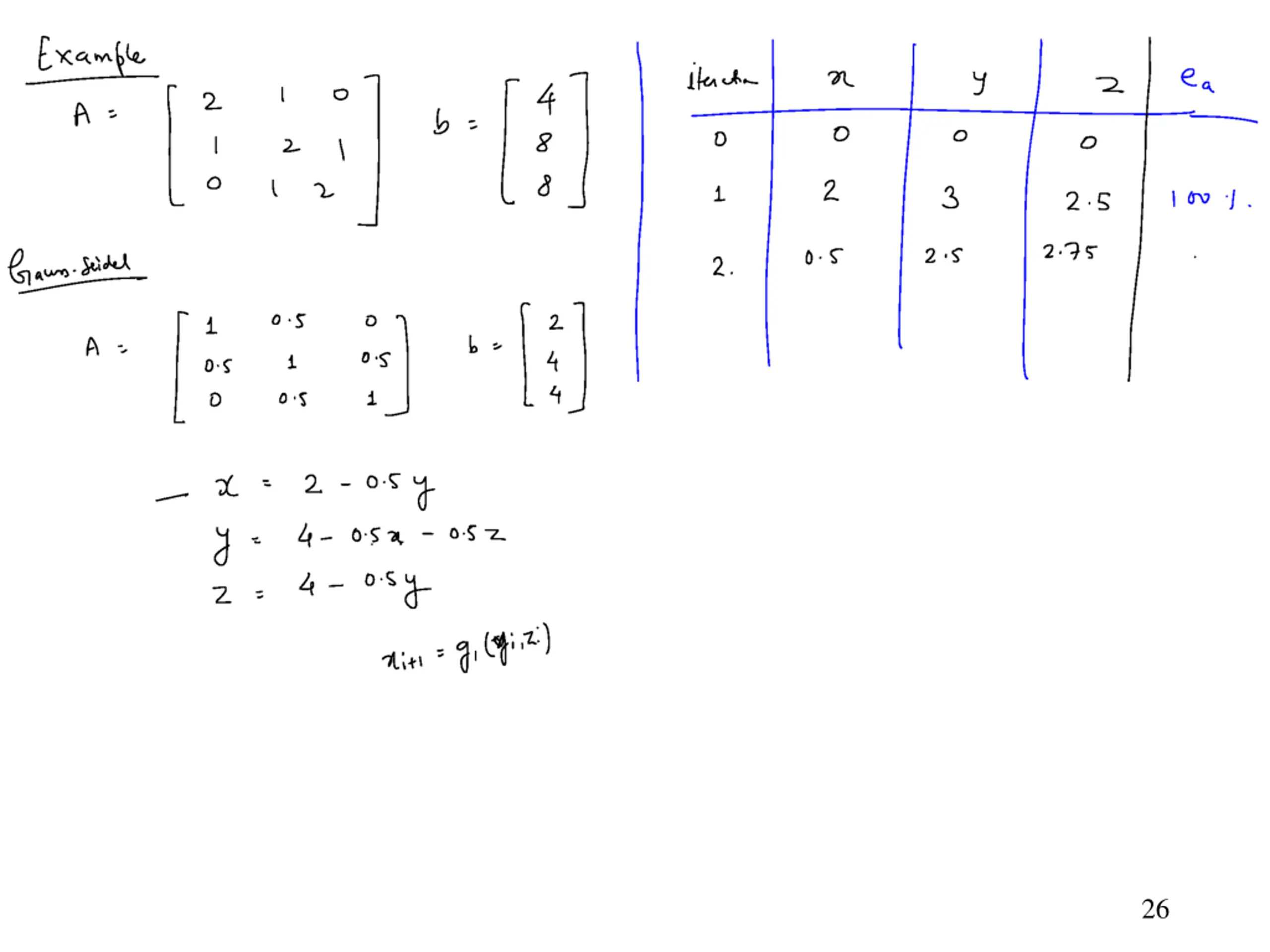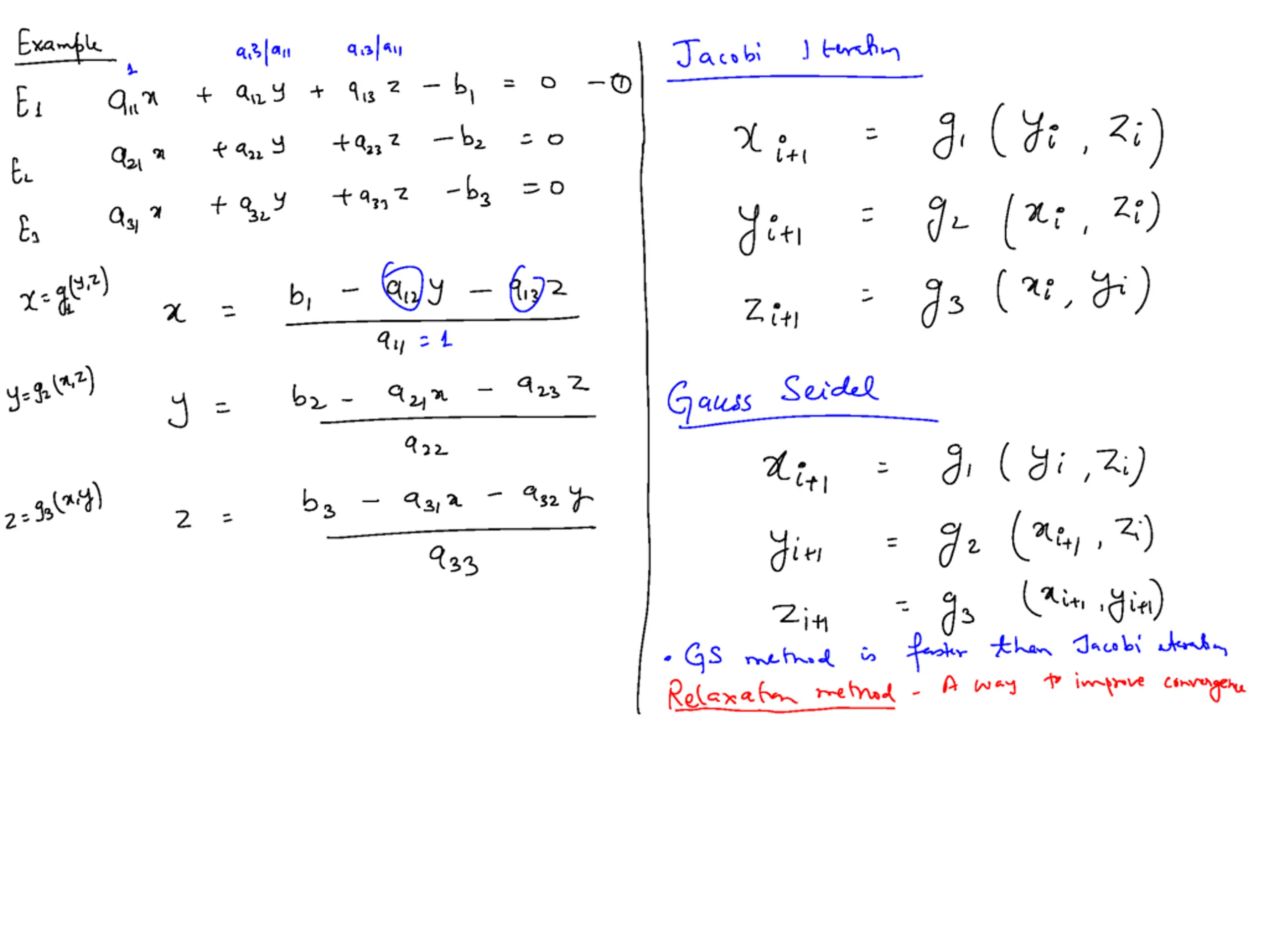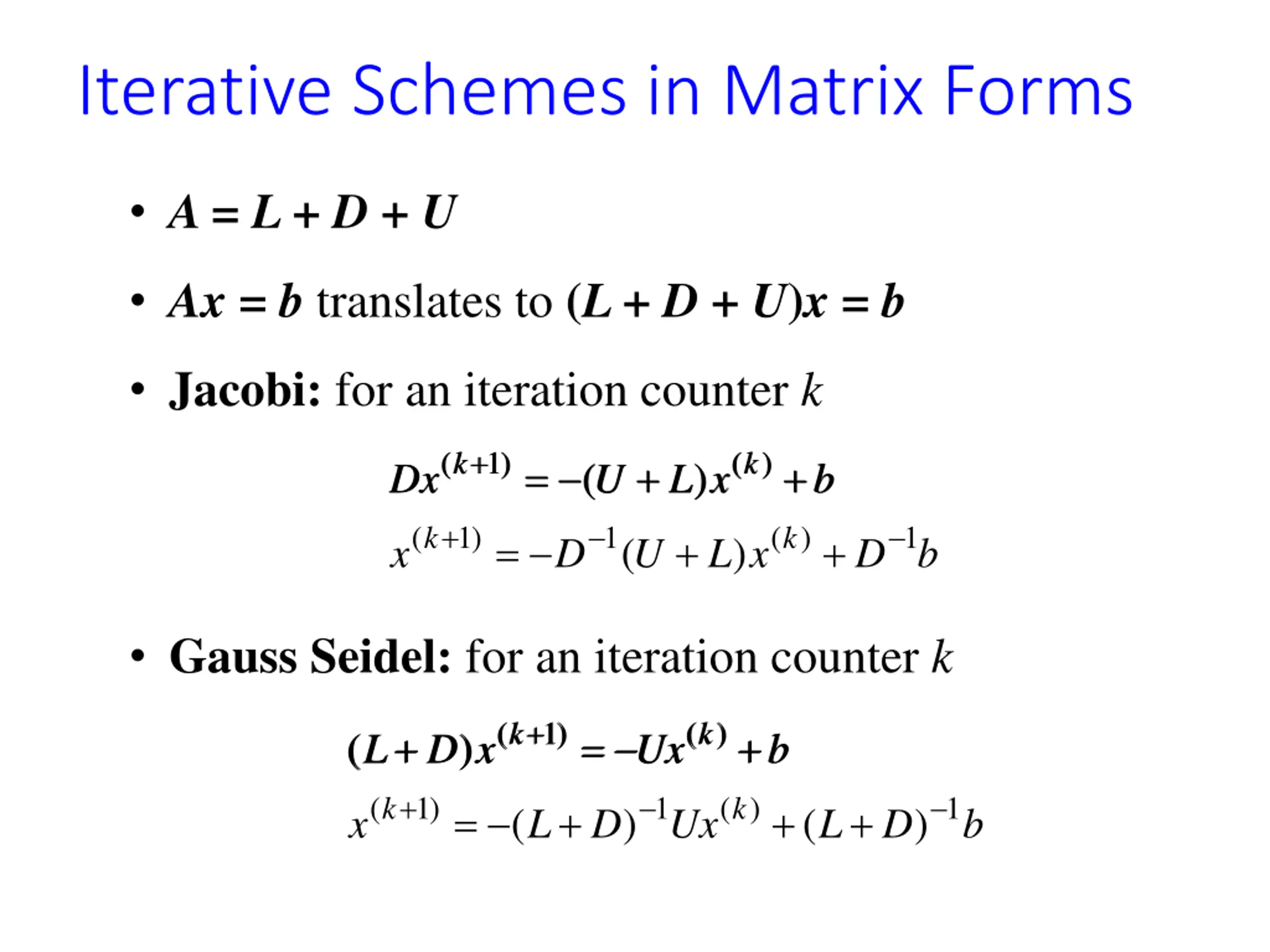 Iterative Schemes in Matrix Forms A = L + D + U Ax = b translates to (L + D + U)x = b Jacobi: for an iteration counter k ) 1 + ) 1 + ( ( ( ( ) ) k k k k = = + + + + U ( ) ) U ( Dx Dx L L x x b b ) 1 + ) 1 + ( ( 1 1 ( ( ) ) 1 1 k k k k = = + + + + U ( U ( ) ) x x D D L L x x D D b b Gauss Seidel: for an iteration counter k ) 1 + ) 1 + ( ( ( ( ) ) k k k k + + = = + + ( ( ) ) L L D D x x Ux 1 ) b b Ux ) 1 + ) 1 + ( ( 1 ( ( ) ) 1 1 k k k k = = + + + + + + ( ( ) ( ( ) ) x x L L D D Ux Ux L L D D b b